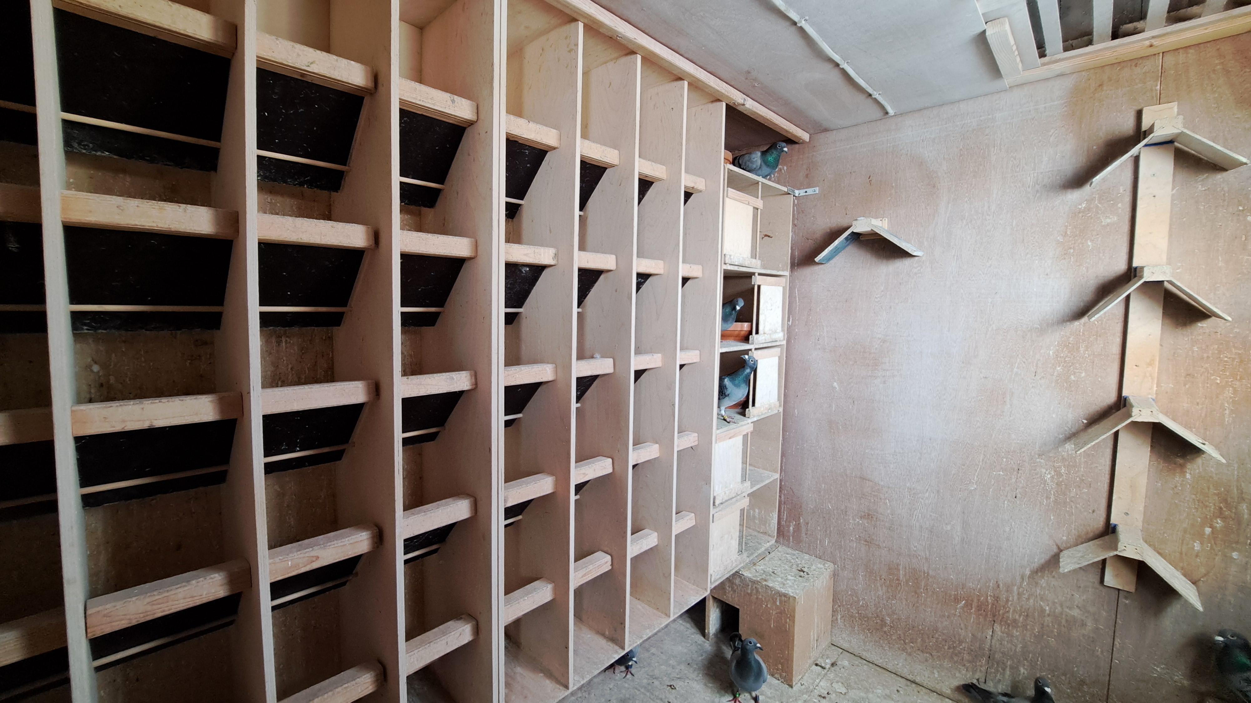 Eens de jongen op de vluchten zitten worden ze gespeeld op de schuifdeur en als extra motivatie worden er hoekjes gemaakt waar de duiven naar believen gebruik van kunnen maken.