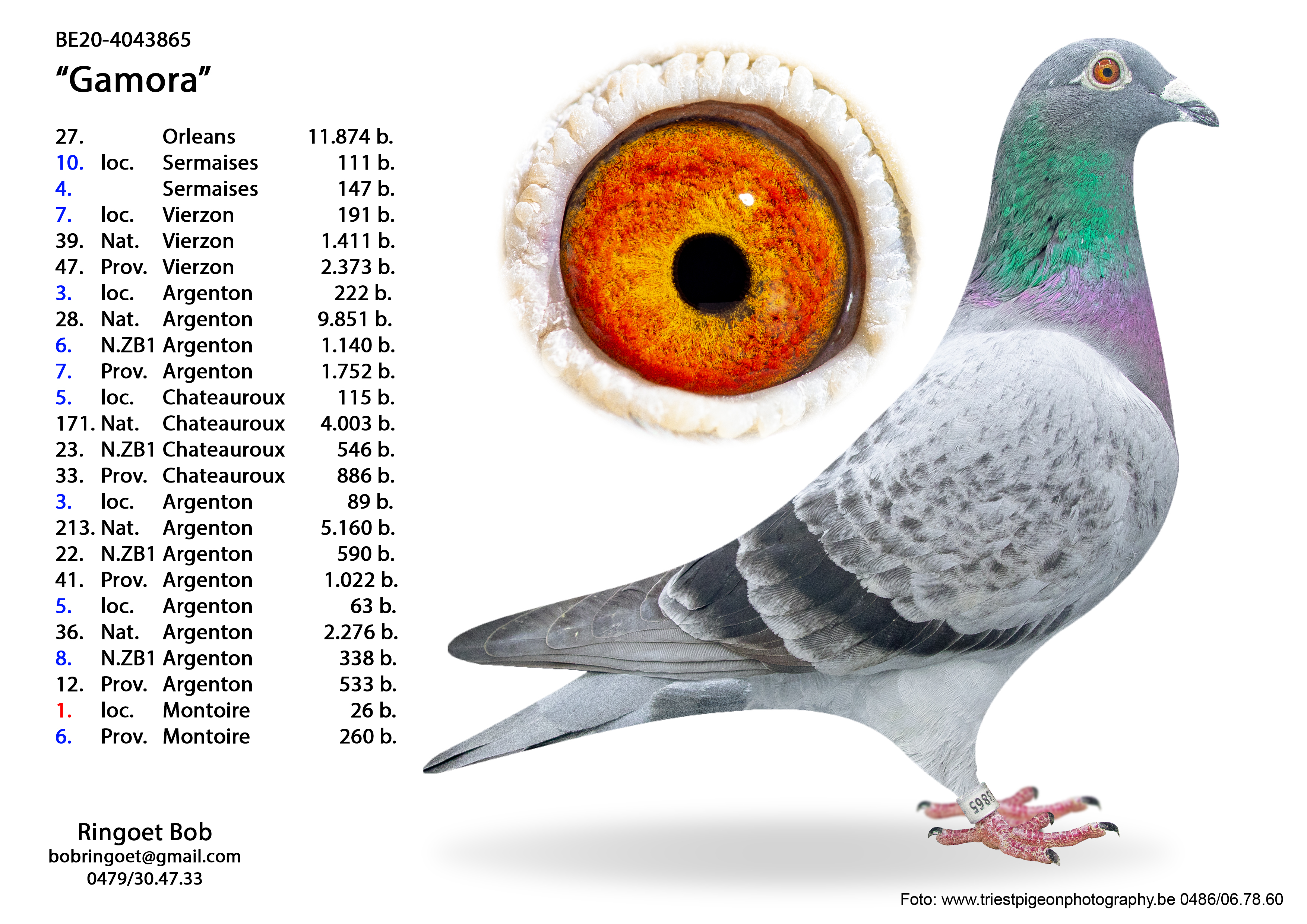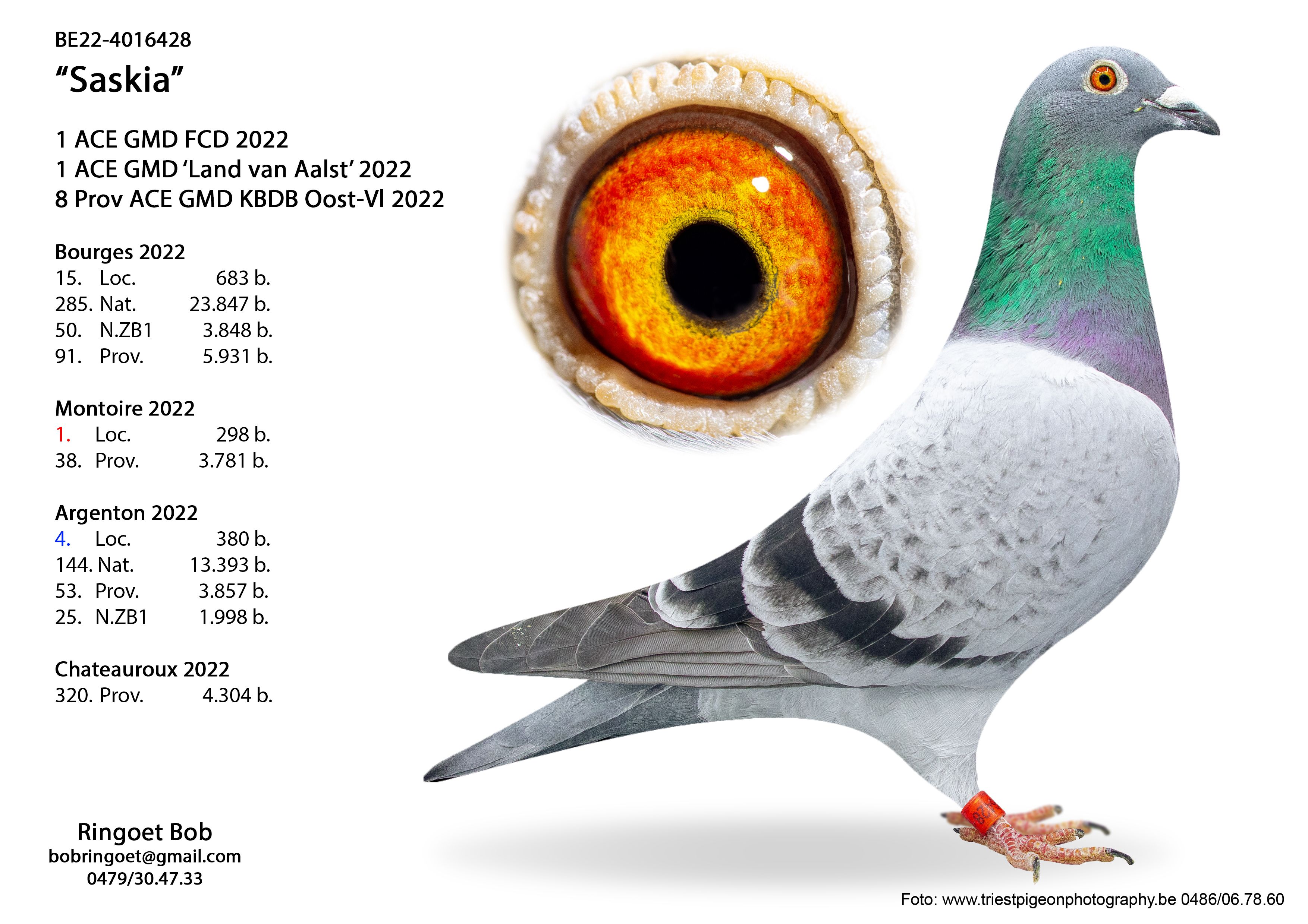 • speelde dit jaar 2 Nat.Z.Bourges met een jong uit een bevlogen duivin van Bob en behaalde 5e Super asduif Hafo-Dender met een aangekochte bon 2024.