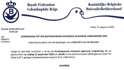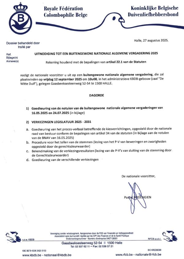 28-08-2025 Mededeling van de KBDB – Buitengewone Nationale Algemene Vergadering 12-09-2025 – voorlopige dagorde