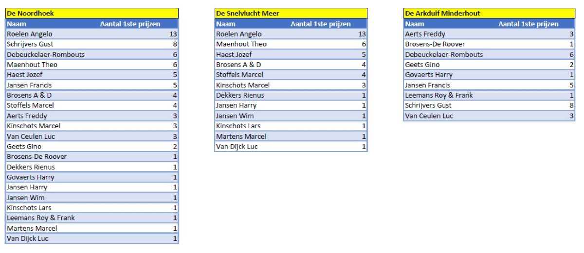 de NOORDHOEK: (de Snelvlucht MEER & de Arkduif Minderhout) Overzicht 1ste prijswinnaars 2023
