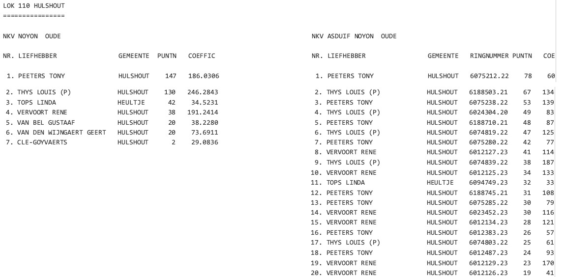 Klik hier voor de Snelle Vlucht HULSHOUT Kampioenschappen 2024 Noyon Oude