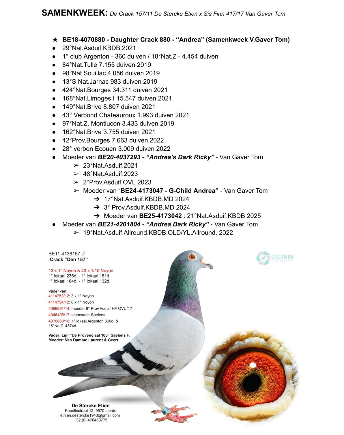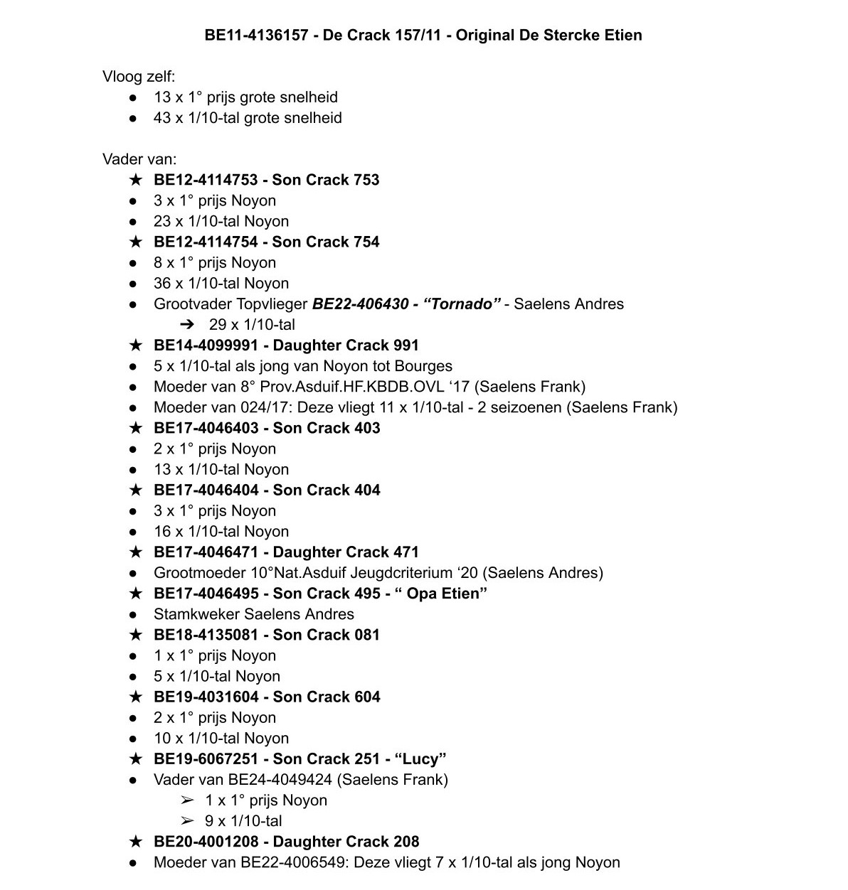 Enerzijds de ‘Crack 157/11” (BE11-4136157), een ongelofelijke topper! Goed voor 13 x 1° prijs en 43 x 1/10-tal! Nog maar gezwegen van de nakomelingen, want tot in de 4e generatie zorgt deze stamvader voor nationale asduiven!