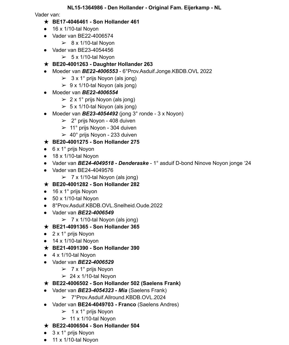 Anderzijds ‘Den Hollander” Fam.Eijerkamp (NL15-1364986)! Deze duif werd bekomen via Wim De Roeck. Té jong aangekomen in Lierde om nog mee op te leren. Dus nieuw bloed op het kweekhok. Nog geen moment spijt van die keuze! Ook andere duiven die via Wim richting Lierde kwamen gaven een mooie boost in de kweeklijnen! Waarvoor nogmaals een grote dank! Ook van deze topper bewijzen de nazaten mee te kunnen dingen voor de hoogste prijzen en kampioenschappen!