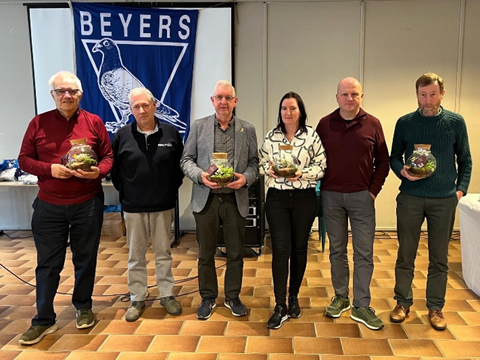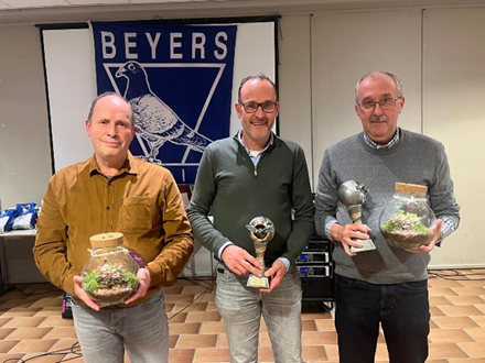 Het podium van de kampioenen bestaat uit goud voor Steenaerts Willy, zilver voor Vanmeert Roger&Koen (ook kampioen meeste prijzen) en brons voor Schroyen-Stockmans.
