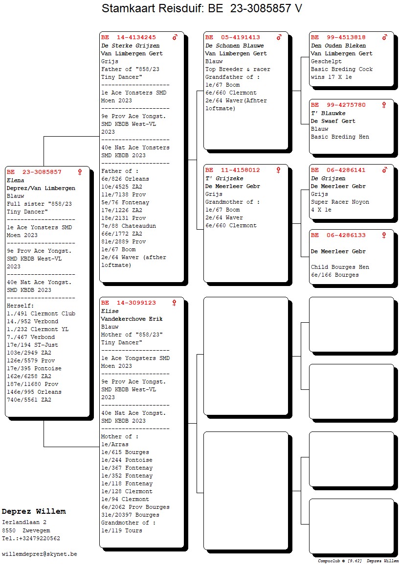 Zij werd gekweekt uit topkweker "De Sterke Grijzen" die rechtstreeks werd bekomen bij Gert Van Limbergen uit Lede, gekoppeld tegen een duivin van Eric Vandekerckhove.