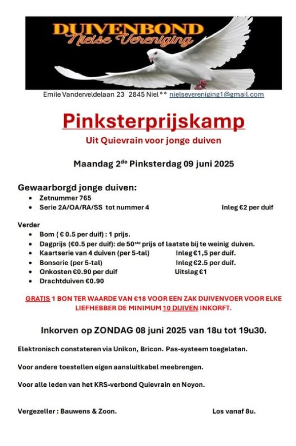 Op 2de pinkstermaandag organiseren wij een prijskamp Quievrain voor jonge duiven. Iedereen van de KRS omtrek is van harte Welkom!