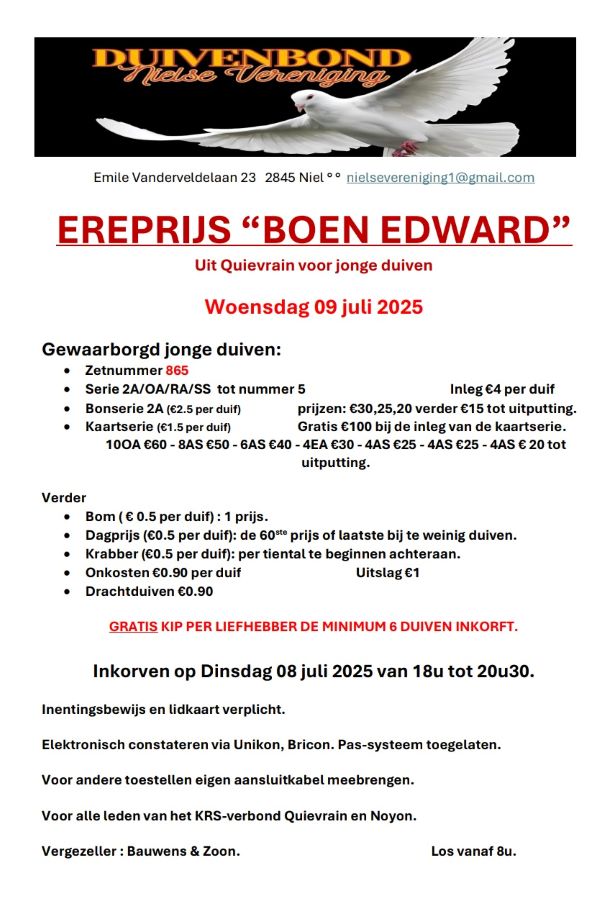 Woensdag 09/07/25 vind onze Ereprijs "Boen Edward" plaats uit Quievrain voor jonge duiven!! Inkorven op dinsdag 8 juli in ons lokaal. Hopelijk tot dan?!