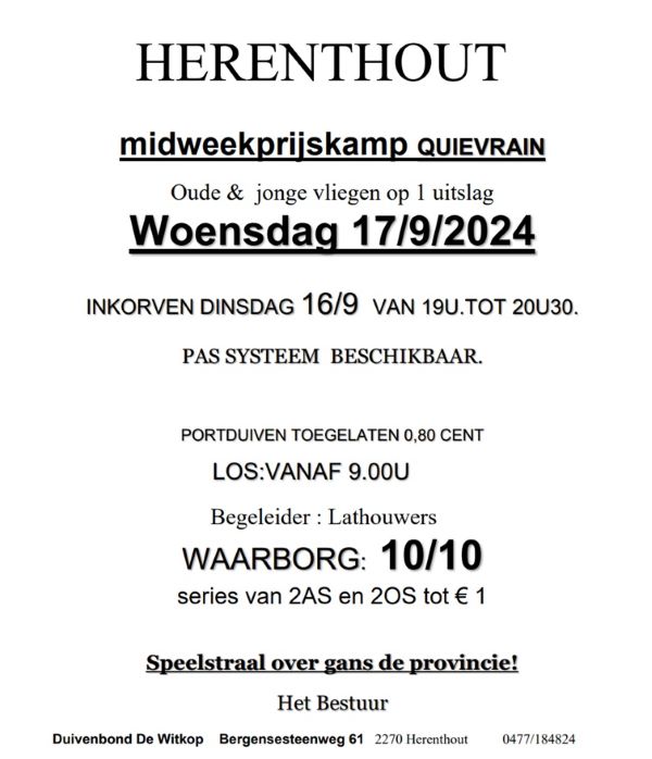HERENTHOUT midweekprijskamp QUIEVRAIN Oude & jonge vliegen op 1 uitslag Woensdag 17/9/2024 INKORVEN DINSDAG 16/9 VAN 19U.TOT 20U30.