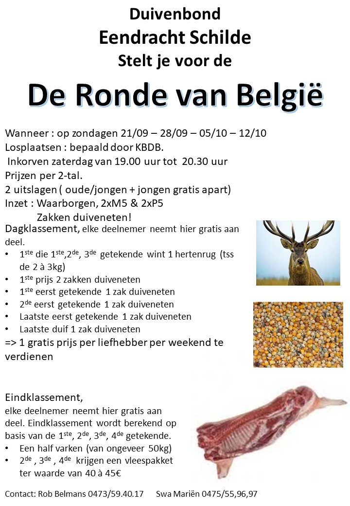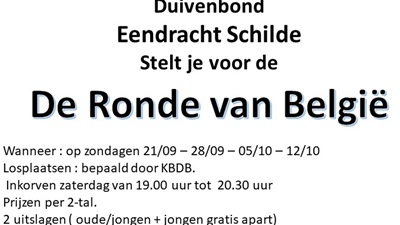 Duivenbond Eendracht Schilde Stelt je voor de DeRondevan België Wanneer : op zondagen 21/09 –28/09 –05/10 –12/10 Losplaatsen : bepaald door KBDB. Inkorven zaterdag van 19.00 uur tot 20.30 uur
