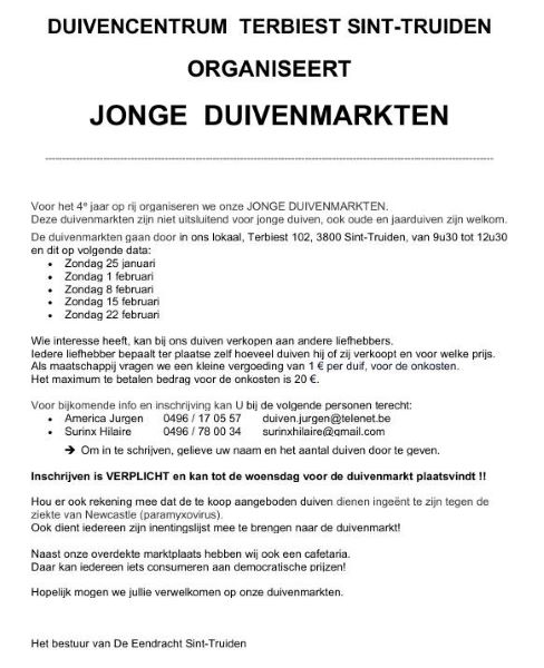 Eendracht ST-TRUIDEN Voor de 4e keer organiseren we weer onze JONGE DUIVENMARKTEN !!!