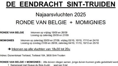 DE EENDRACHT SINT-TRUIDEN Najaarsvluchten 2025 RONDE VAN BELGIE Inkorven op vrijdag 19/09 en 26/09 Lossing op zaterdag 20/09 en 27/09