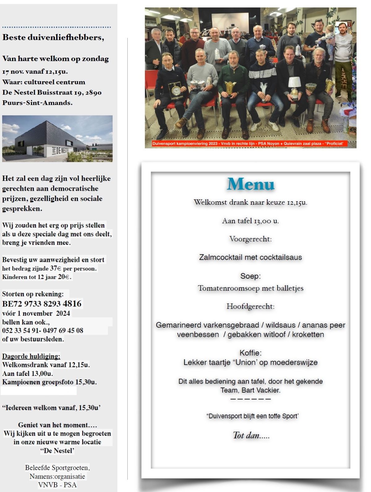 Eetfestijn Kampioenendag VERENIGD NOYONVERBOND IN RECHTE LIJN Van harte welkom op zondag 17 nov. vanaf 12,15u. Waar: cultureel centrum De Nestel Buisstraat 19, 2890 Puurs-Sint-Amands.