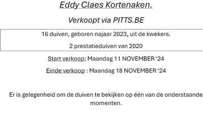 Er is gelegenheid om de duiven te bekijken op één van de onderstaande momenten. Tentoonstelling van de duiven: VRIJDAG 8 november ’24 van 19u tot 21u “De Ware Liefhebbers Geetbets” & ZONDAG 10 november ’24 van 9u30 tot 12u& “OBRAFO-Tienen” & VRIJDAG 15 november ’24 van 16u tot 21u & “PITTS “ Gert Van Limbergen