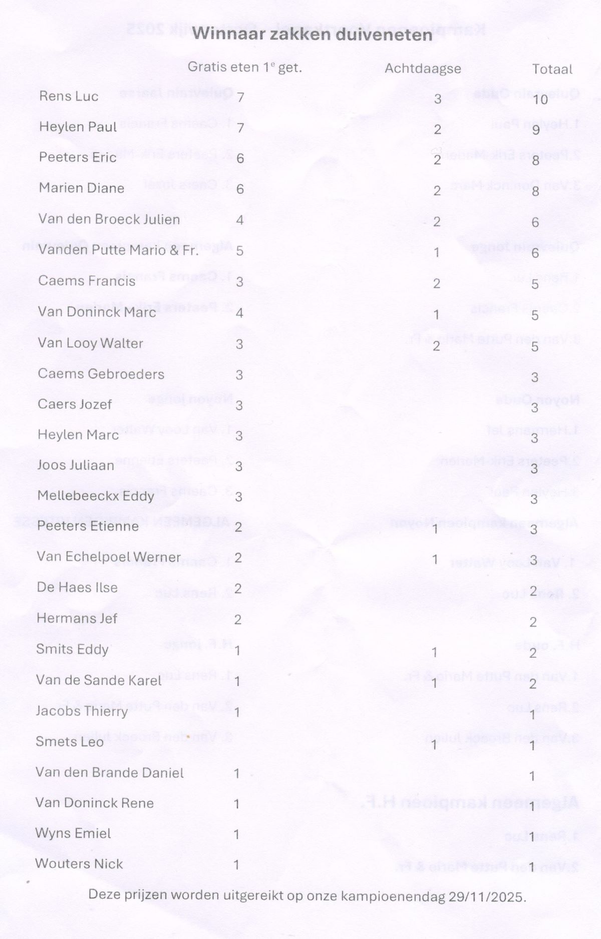 Seizoensoverzicht 2025 Kempenduiven: Francis Caems (Voortkapel)