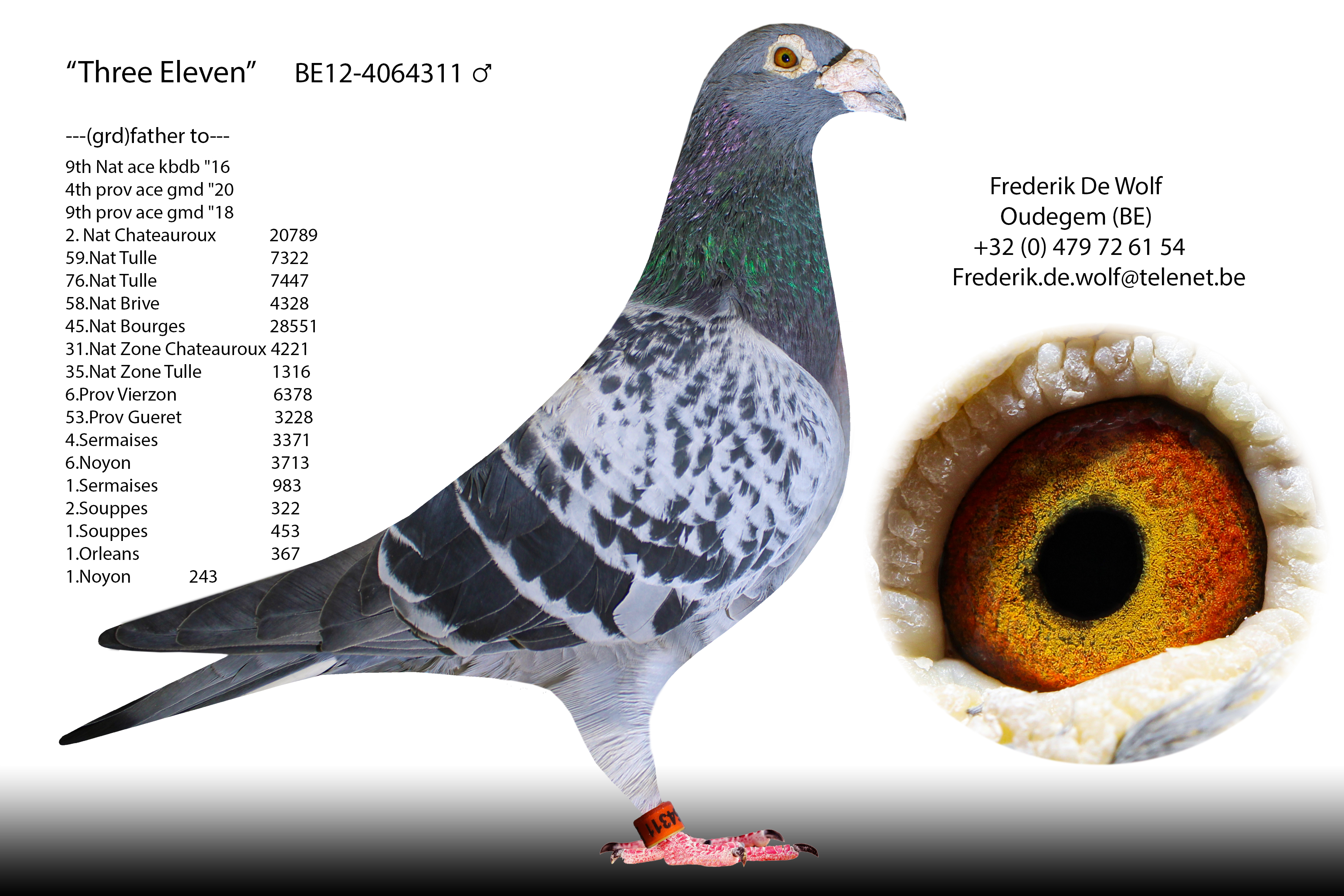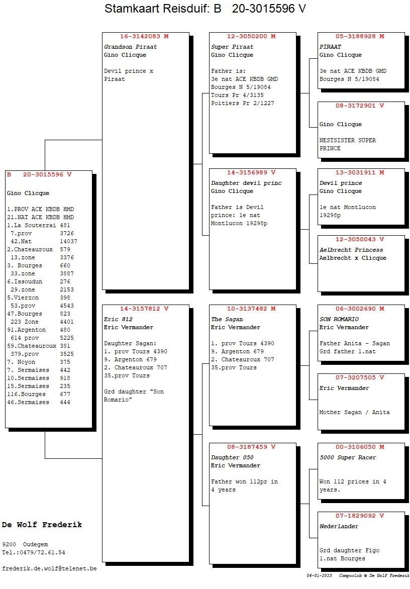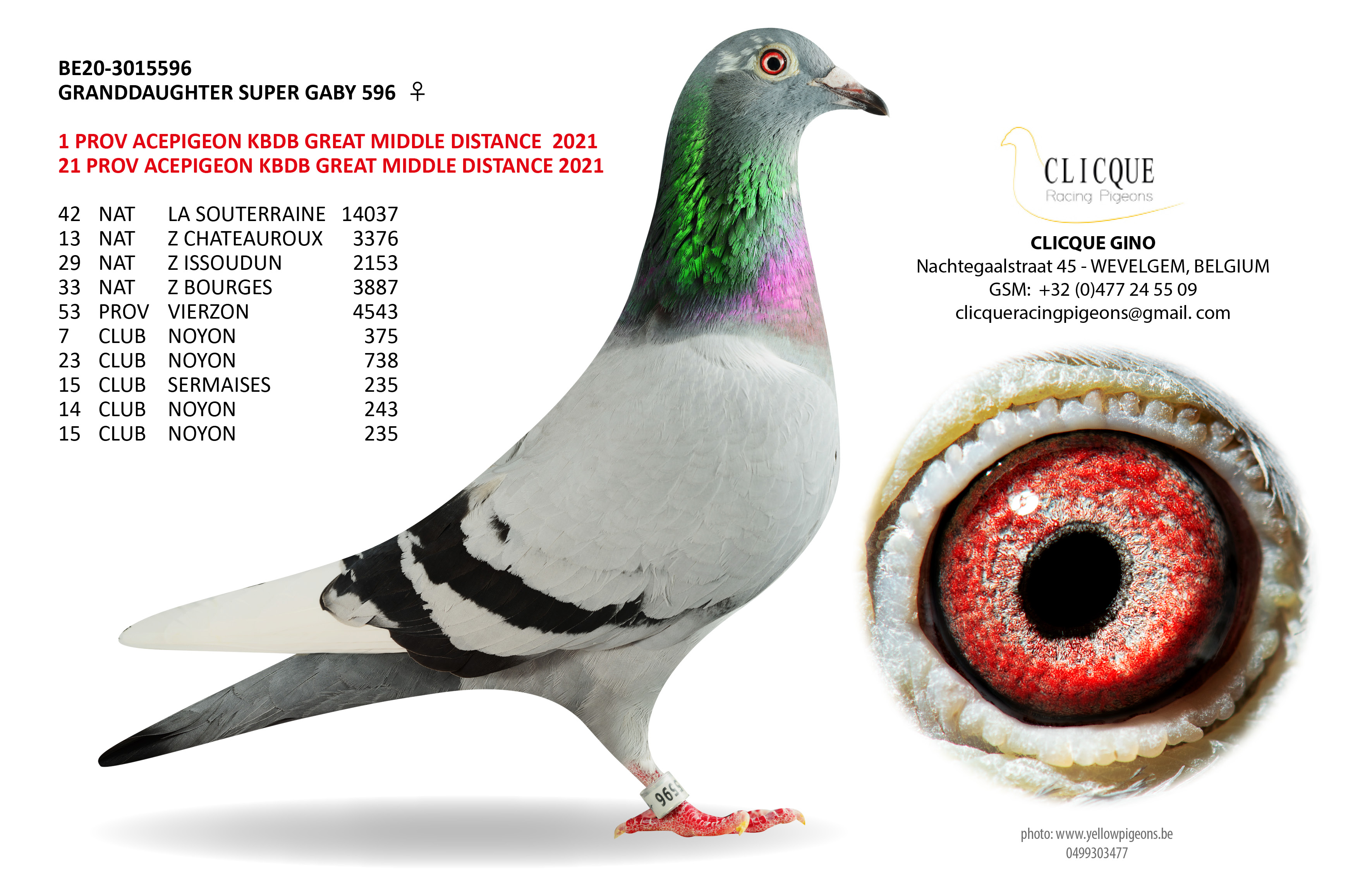 Overgootvader van “Golden Leonie” zij won 1ste Nationaal Libourne 3.317 duiven ( snelste van 6.309 duiven ), 20ste Nationaal Souillac 4.476d – 59ste Nationaal Bourges 25.096d – 89ste Nationaal Argenton 9.851d bij Gino Clicque