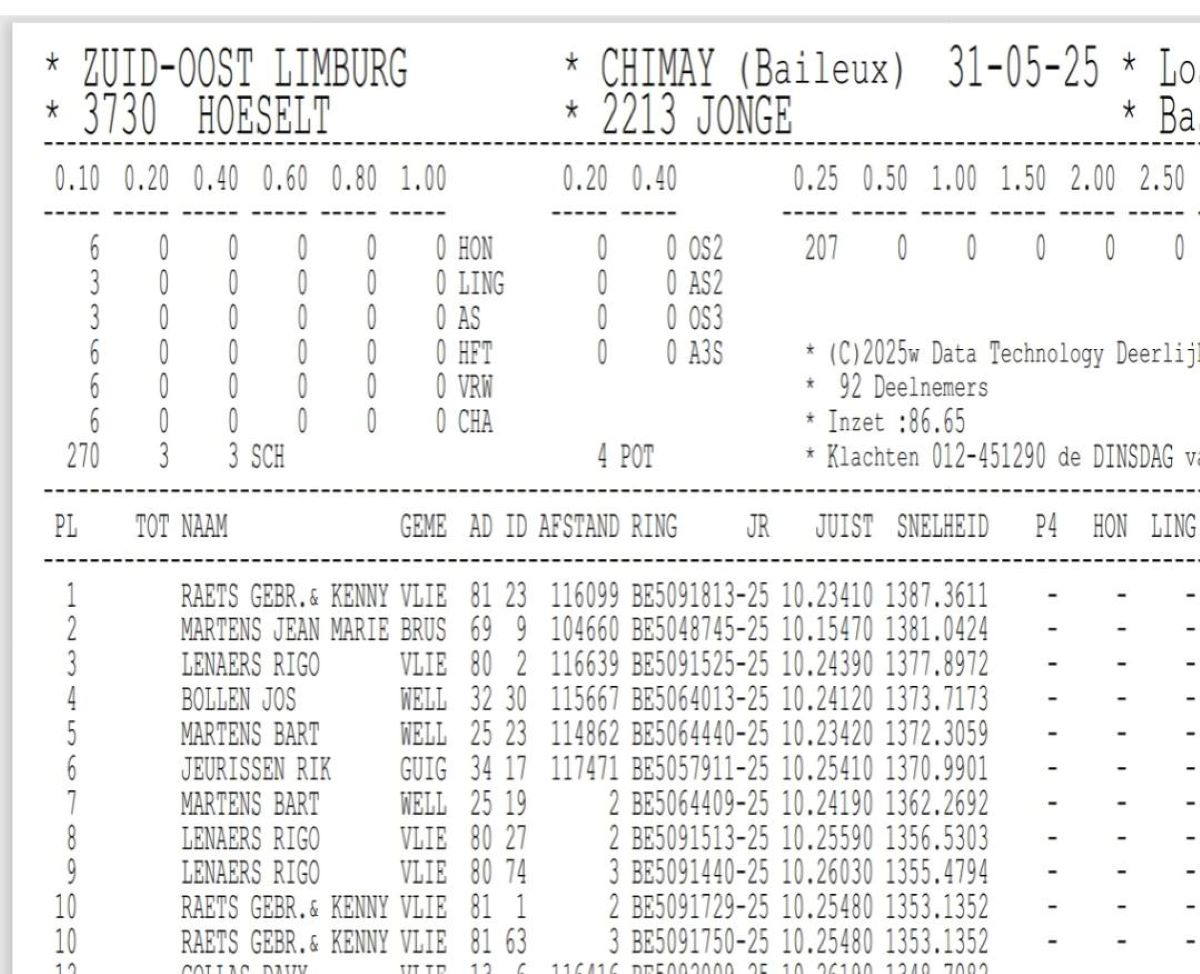 - 185-376e Bourges I 2025 (24/05/2025) - Voorlopig resultaat PE Limburg (Oude) Totaal aantal duiven: 2.307