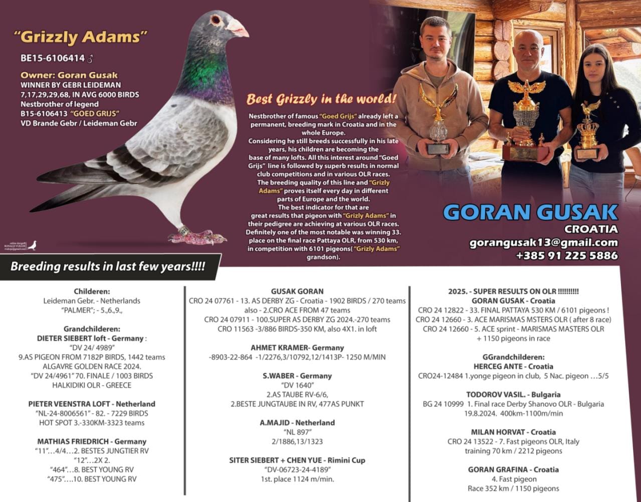 Als nestbroer van het beroemde “Goed Grijs” van Gebroeders Leideman, drukte "Grizzly Adams" een blijvende stempel op de duivensport over de hele wereld. De Kroatische Goran Gusak wist deze topduif aan te kopen nog vóór het "Goed Grijs" een absolute hype werd en dit bleek een schot in de roos, want "Grizzly Adams" bevestigde zijn afkomst en kweekwaarde met brio! Ondanks zijn gevorderde leeftijd kweekt hij nog steeds succesvol en vormen zijn kinderen ondertussen de basis op vele hokken. De kweekkwaliteit van de “Goed Grijs”-lijn wordt bovendien bevestigd door uitstekende resultaten in clubwedstrijden en diverse one loft-races over heel Europa en de wereld. Eén van de opvallendste prestaties was een 33e plaats in de finale van Pattaya OLR (530 km) tegen 6101 duiven met een kleinzoon van “Grizzly Adams”.