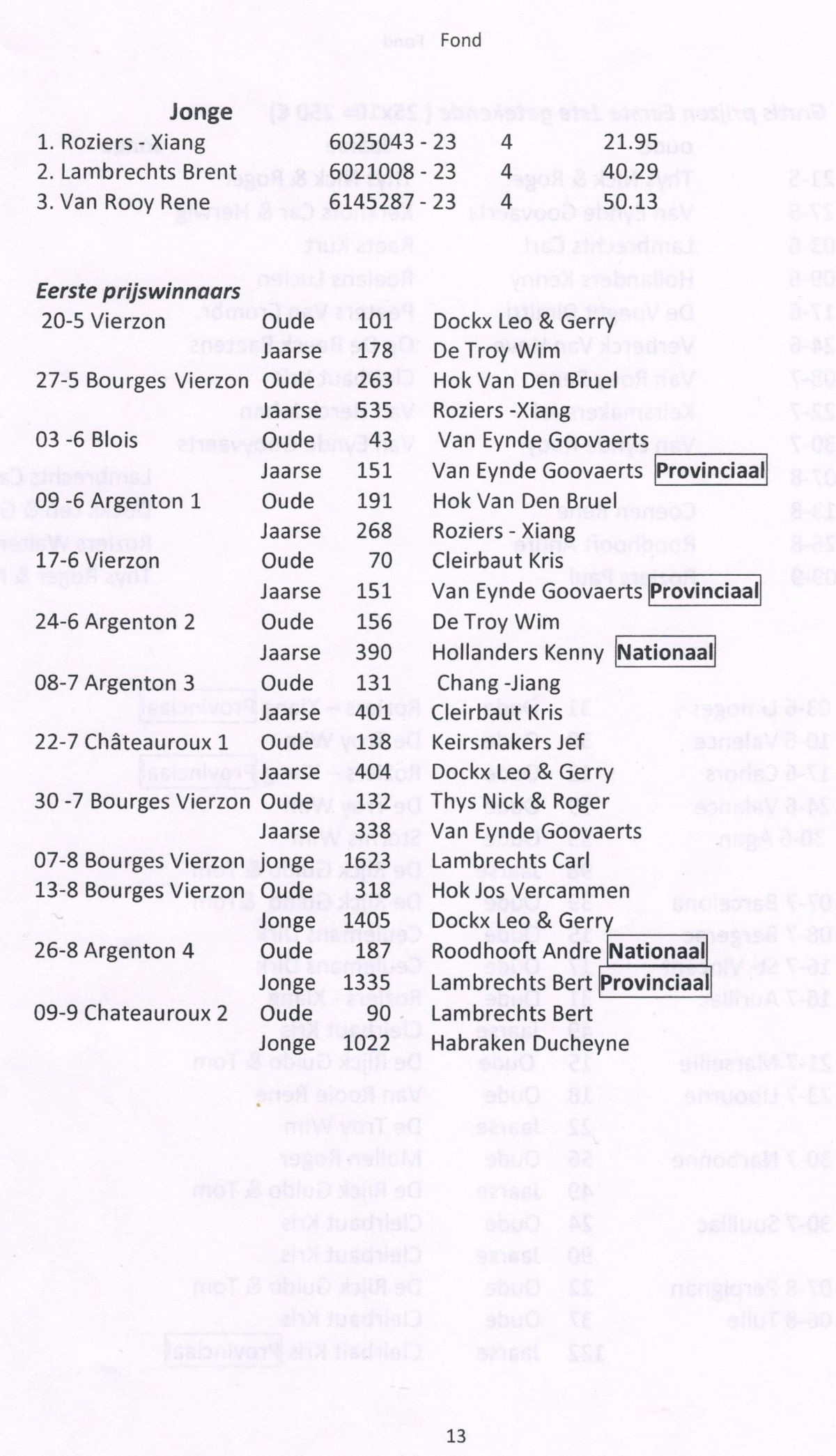 Kampioen Oude duiven 1e get DagFond: Roziers-Xiang