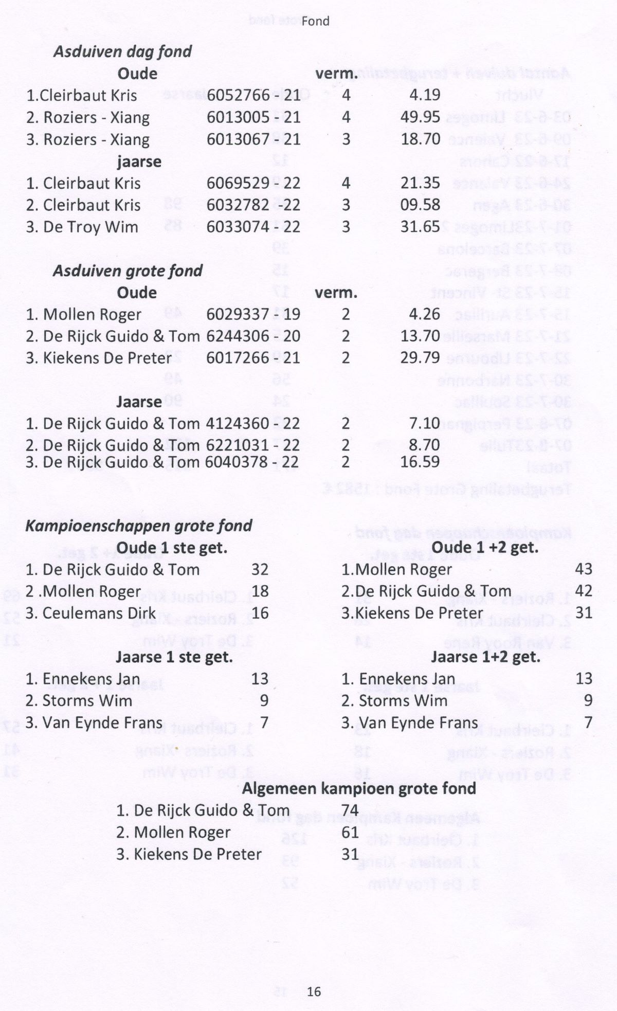Asduif Jaarse duiven Grote Fond: Tom & Guido De Rijck