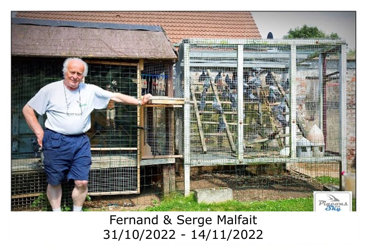 Vader Fernand Malfait (77) startte in 1969 als zelfstandig carrossier en in 1972 begon hij met duiven op de halve fond. Reeds als jonge kerel was ook Serge gepassioneerd door de duivensport en na jaren van successen op de halve fond, werd de overstap gemaakt naar de fond en zware fond. Nu baat Serge (49) samen met zijn jongste broer een garage uit te Jabbeke. Hoewel vader intussen gepensioneerd is, helpt hij nog zoveel mogelijk mee in de garage van zijn zonen. Fernand verzorgt thuis de vliegploeg die bestaat uit zo’n 25 oude duiven en een 30-tal jaarlingen, terwijl Serge zich over de kweekduiven ontfermt die bij hem gehuisvest zijn en ze koppelt. Samen beslissen ze welke duiven op welke vluchten worden meegegeven.