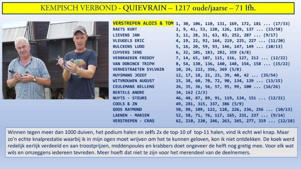 Alois & Tom Verstrepen uit Wiekevorst (Antwerpen) winnen de eerste prijs uit Quievrain op 7/08/22 van 359 jonge duiven in het samenspel ROND NETE & WIMP.