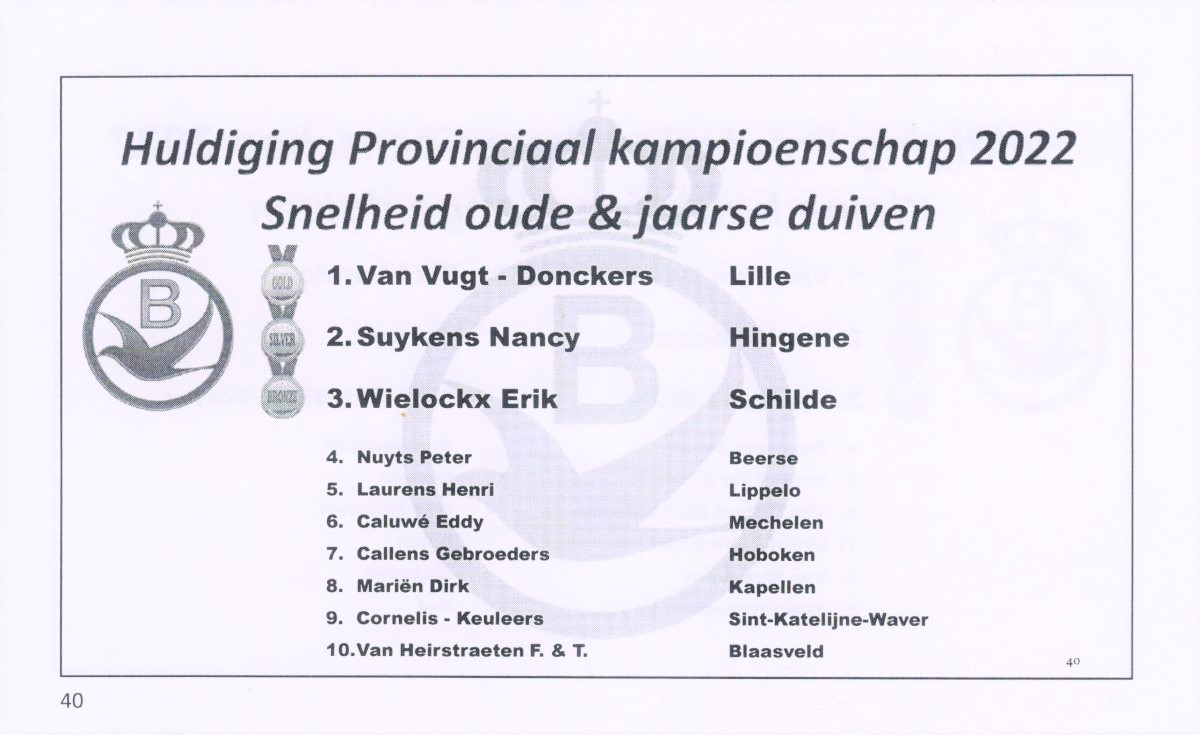 - 9de Provinciaal Kampioen Oude & Jaarse duiven Snelheid 2022 PE ANTWERPEN