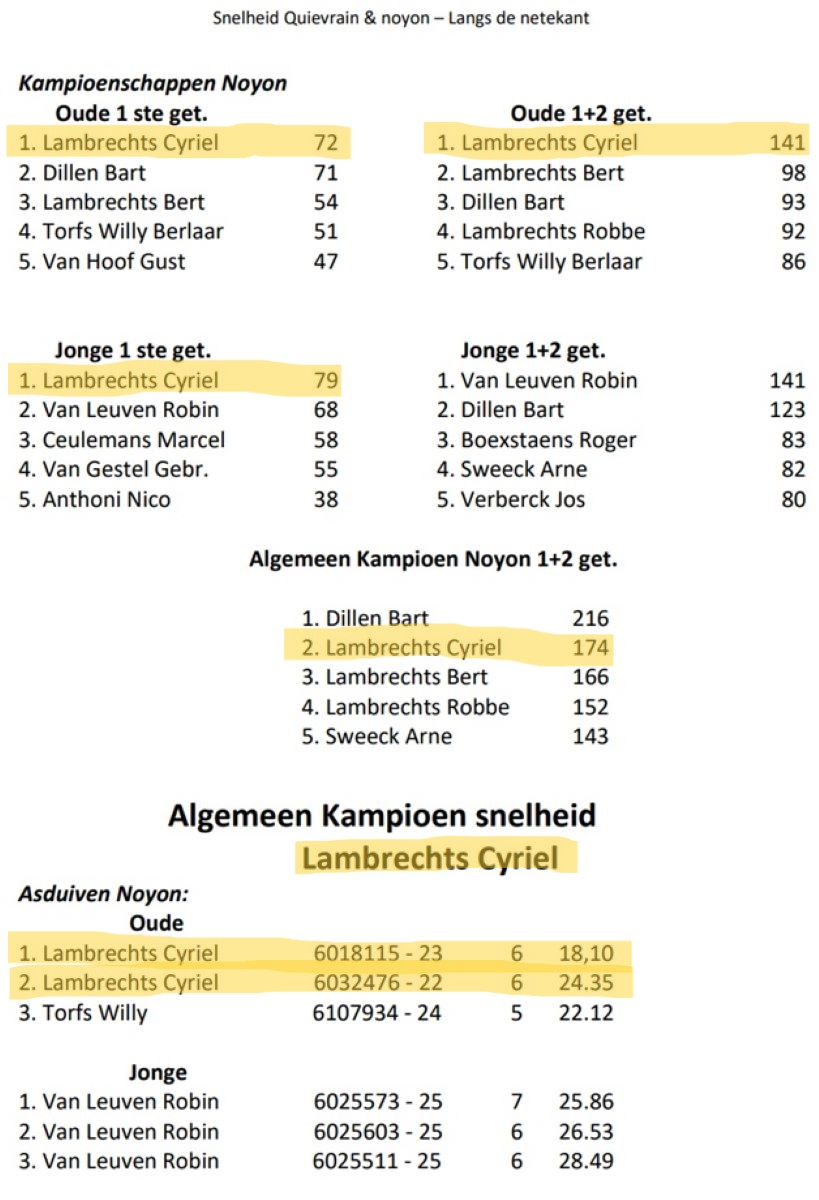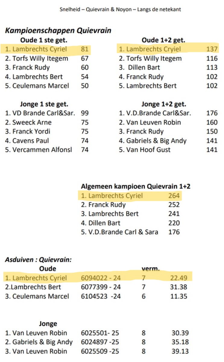 Opnieuw mooie resultaten voor CYRIEL LAMBRECHTS uit Berlaar (Antwerpen), met volgende Top-Noteringen en Ereprijzen de voorbije seizoenen ...