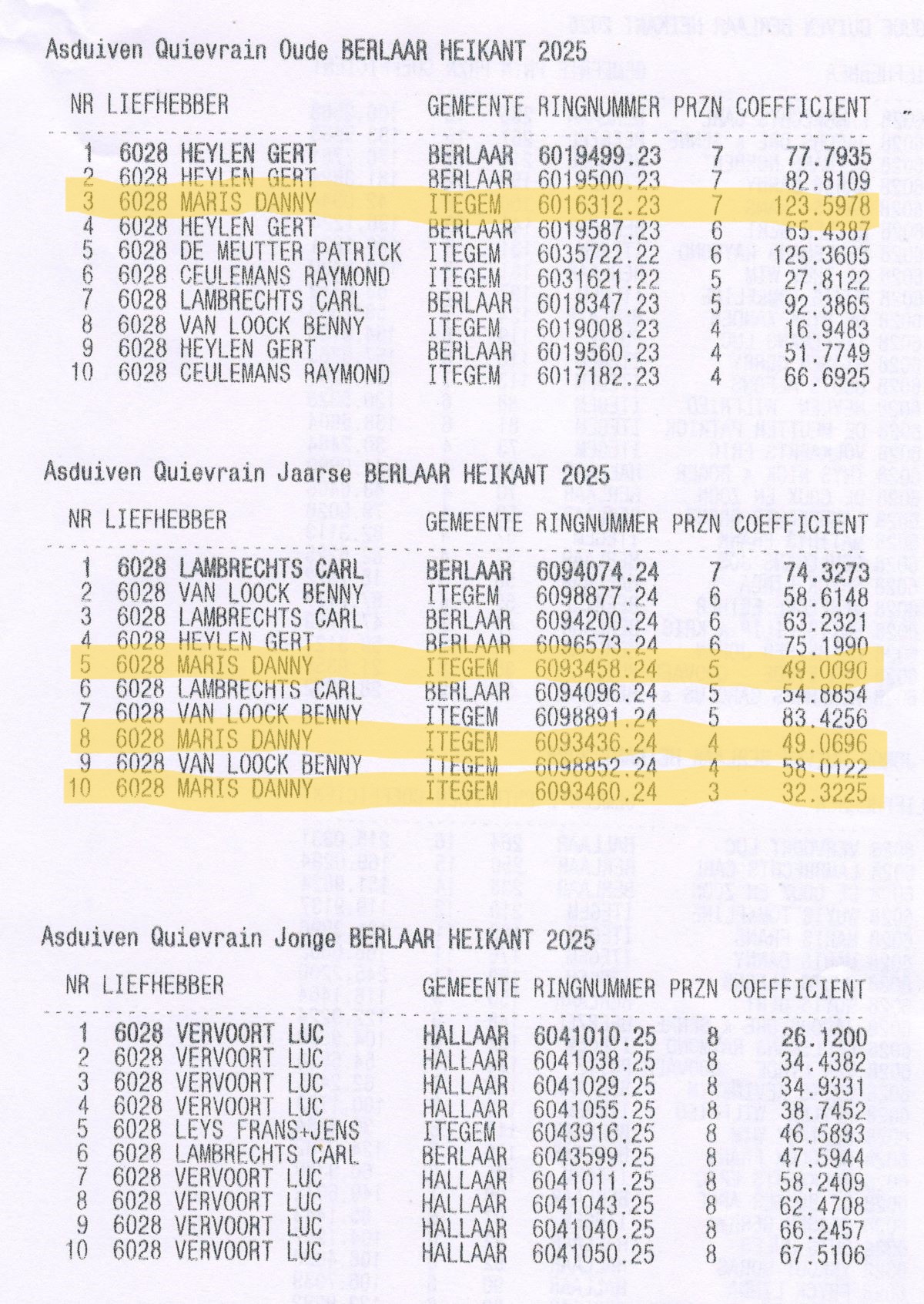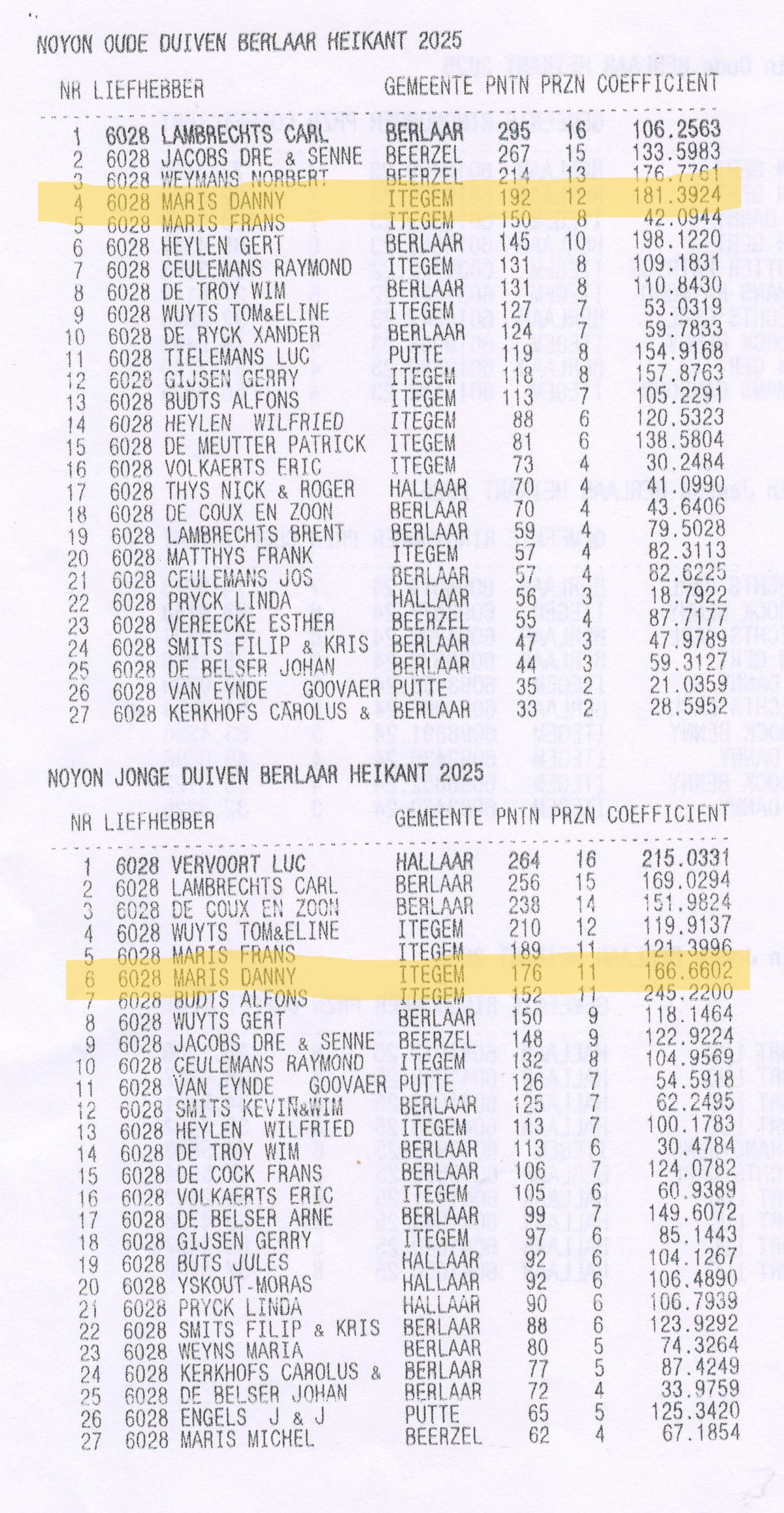 Seizoensoverzicht 2025 Kempenduiven: Danny Maris (Itegem)