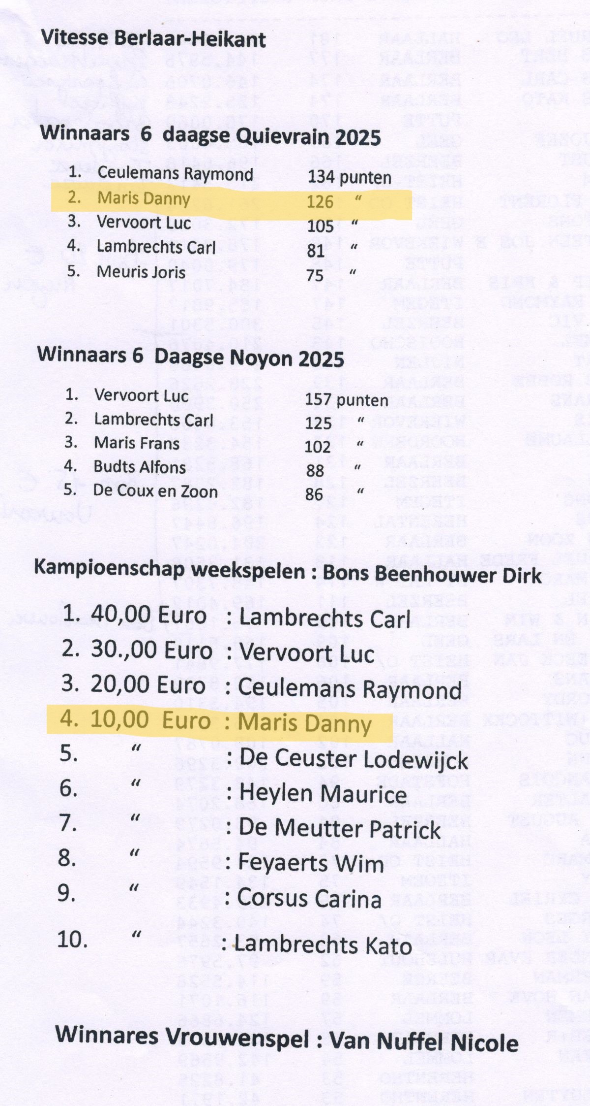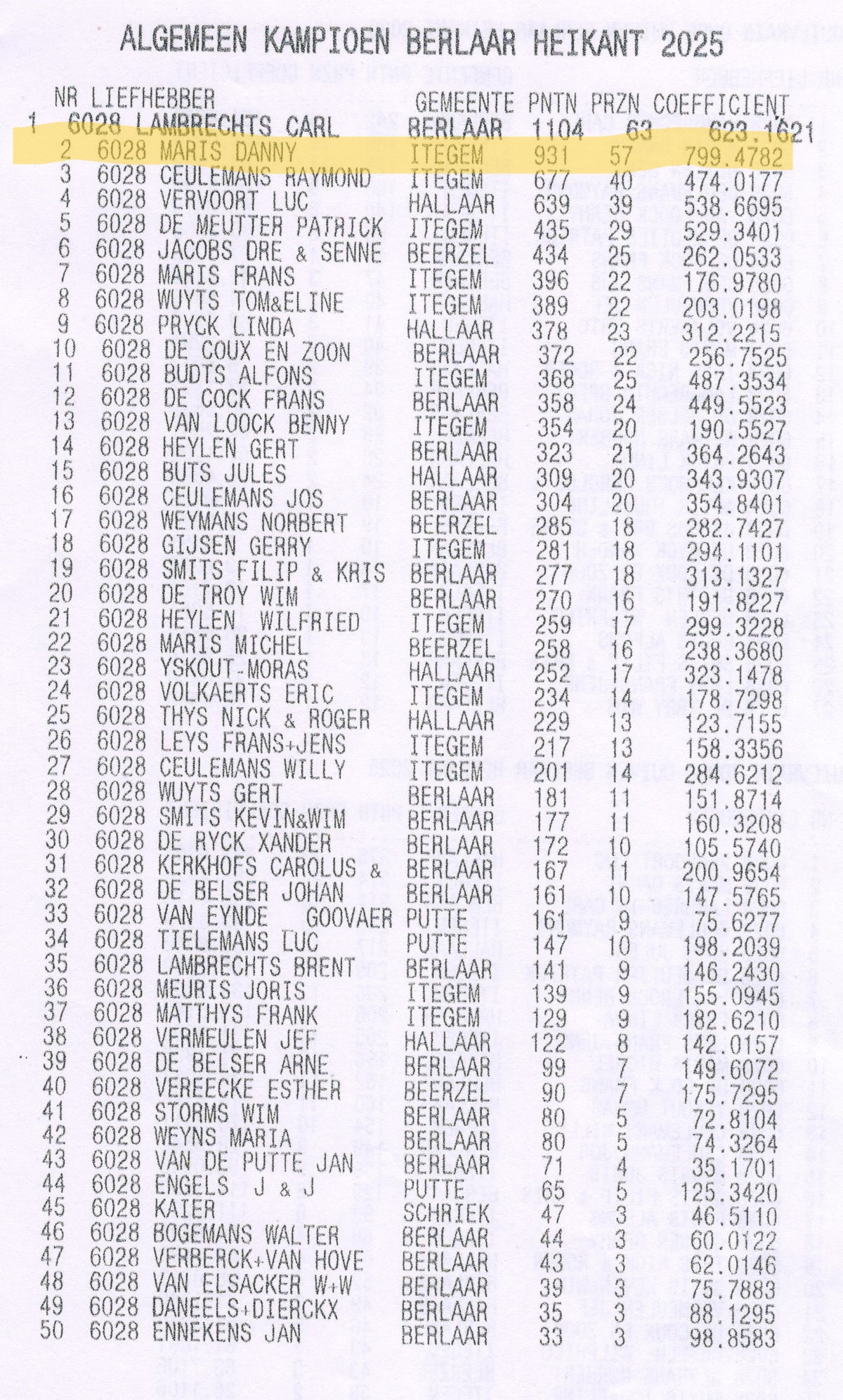 Opnieuw mooie resultaten voor DANNY MARIS uit Itegem - Heist-op-den-Berg (Antwerpen), met volgende Top-Noteringen en Ereprijzen de voorbije seizoenen ...