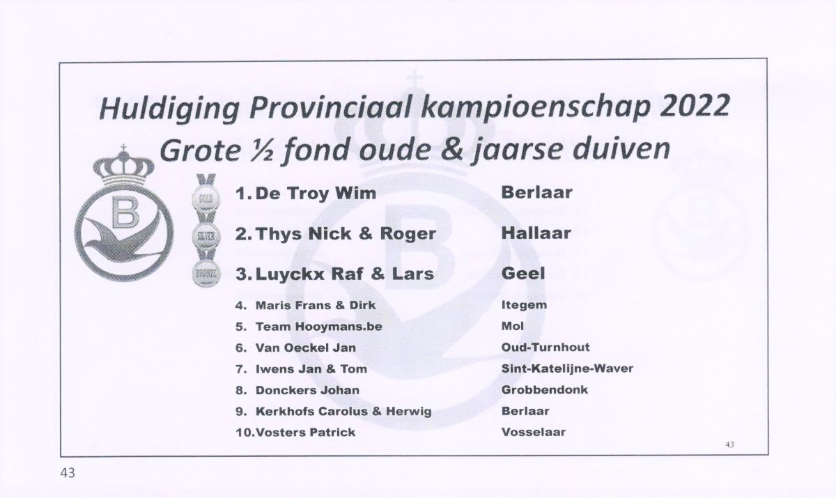 4de Provinciaal Kampioen Oude & Jaarse duiven Grote Halve Fond 2022 PE ANTWERPEN