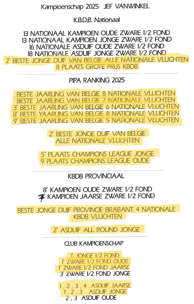 Jef heeft zijn naam al meermaals gevestigd met vermeldingen bij de Olympiade duiven, nationale kampioenschappen en talloze topklasseringen.