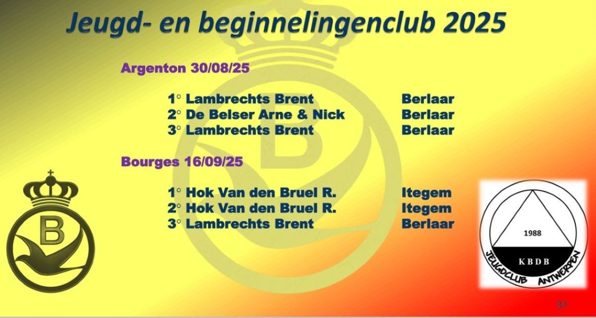 Voorlopige eindstand in de categorie KBDB Nationale Asduif halve fond jaarse 2025. Beste jaarse met 4 prijzen op alle Belgische halve fond vluchten na de vluchten uit Bourges I, Argenton I, Bourges II, La Souterraine, Bourges III, Argenton II, Argenton III en Bourges IV. Er wordt gerekend met volgende beschikbare uitslagen: nationaal, zonaal en provinciaal. > https://www.pipa.be/nl/rankings/kbdb-nationale-asduif-halve-fond-jaarse-2025