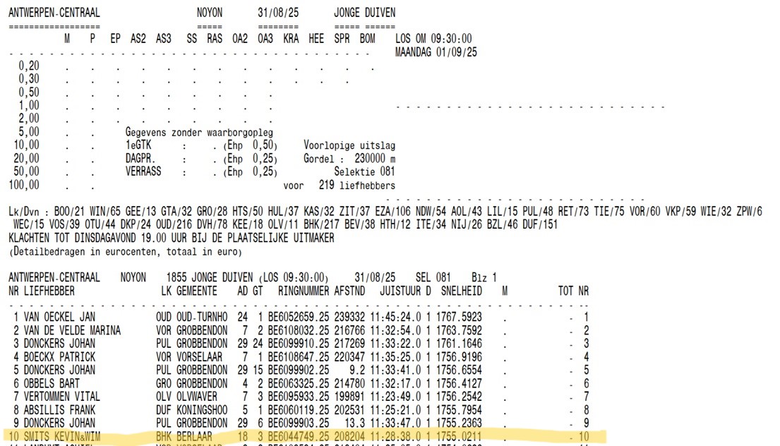 Seizoensoverzicht 2025 Kempenduiven: Filip, Kris, Kevin, Wim Smits (Berlaar)