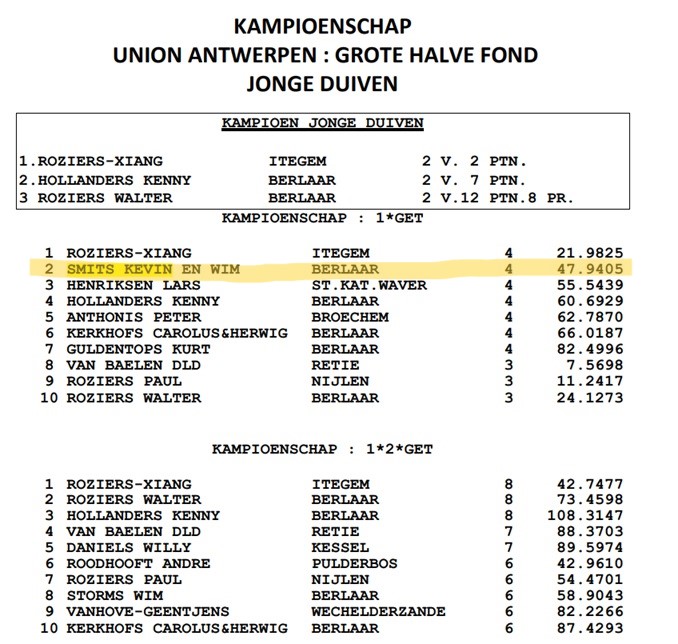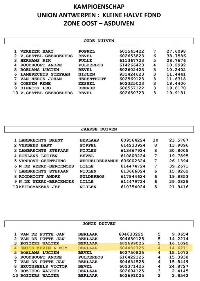 2e KAMPIOEN JONGE DUIVEN 1-2-3e get KLEINE HALVE FOND 2025 samenspel UNION ANTWERPEN ZONE OOST