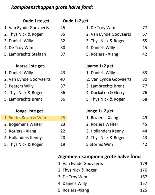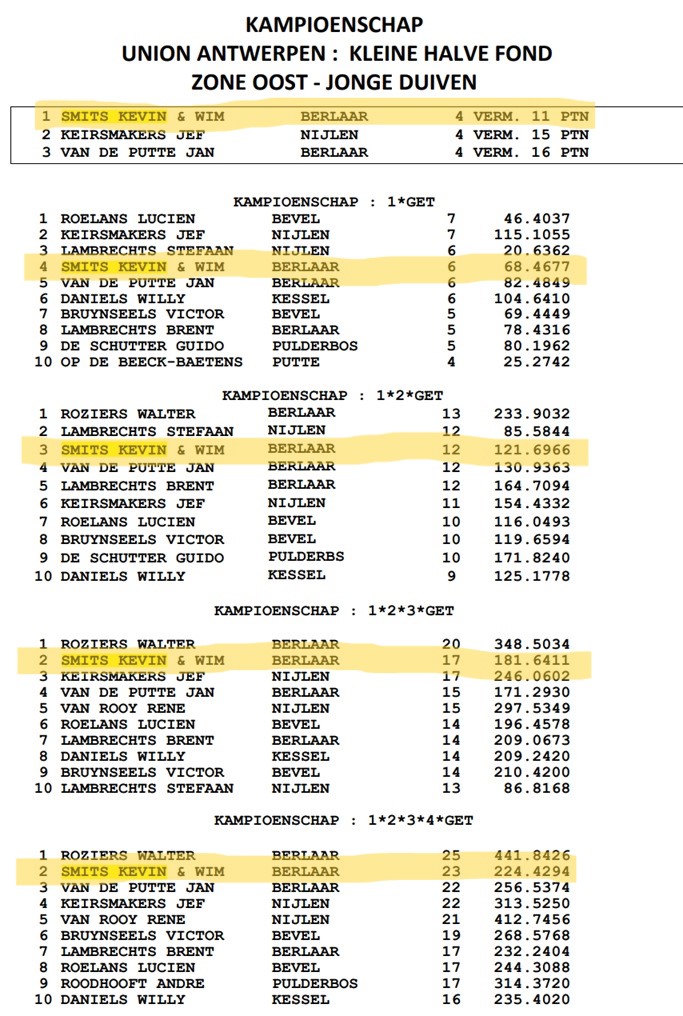 Opnieuw mooie resultaten voor FILIP & KRIS - KEVIN & WIM SMITS uit Berlaar (Antwerpen), met volgende Top-Noteringen en Ereprijzen de voorbije seizoenen ...