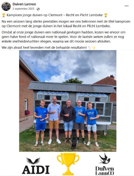 Na een seizoen lang sterke prestaties mogen we ons bekronen met de titel kampioen op Clermont met de jonge duiven in het lokaal Recht en Plicht Lembeke. Omdat al onze jonge duiven een nationaal gevlogen hadden, kozen we ervoor om geen halve fond of nationaal meer te spelen. Voor de laatste weken zullen ze nog enkele snelheidsvluchten vliegen, waarna we dit mooie seizoen afsluiten. We zijn alvast heel tevreden met de behaalde resultaten!