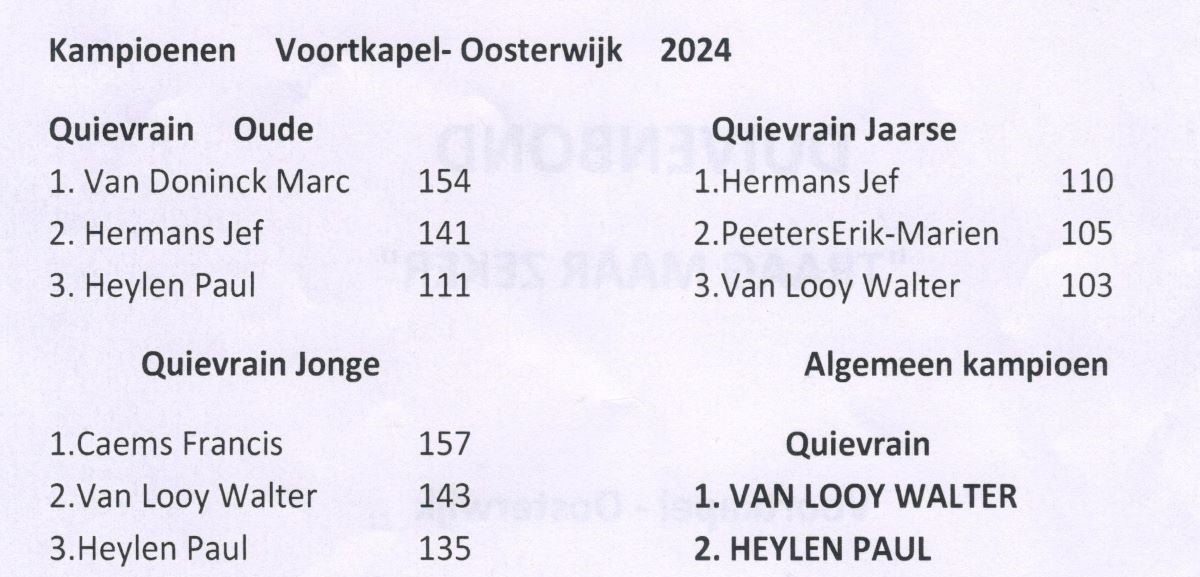 - 1e Algemeen Kampioen Snelheid & 1e Algemeen Kampioen Quievrain & 1e Kampioen Oude duiven Noyon & 1e Kampioen Oude duiven Quievrain & 1e Kampioen Jaarse duiven Quievrain 2023 Traag maar Zeker VOORTKAPEL