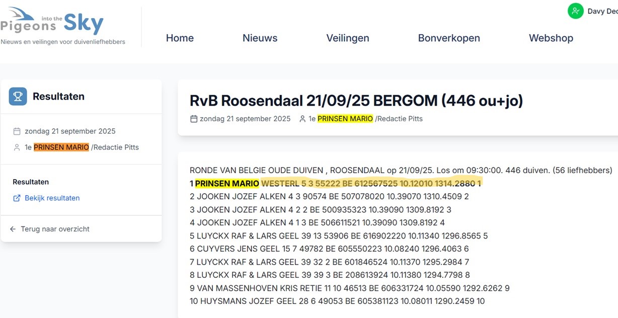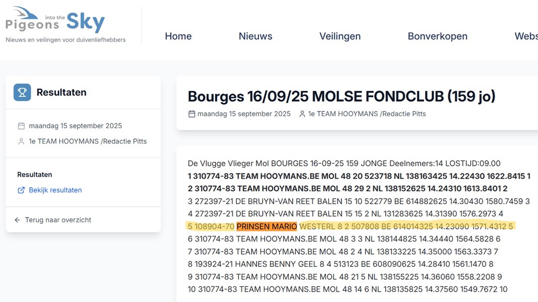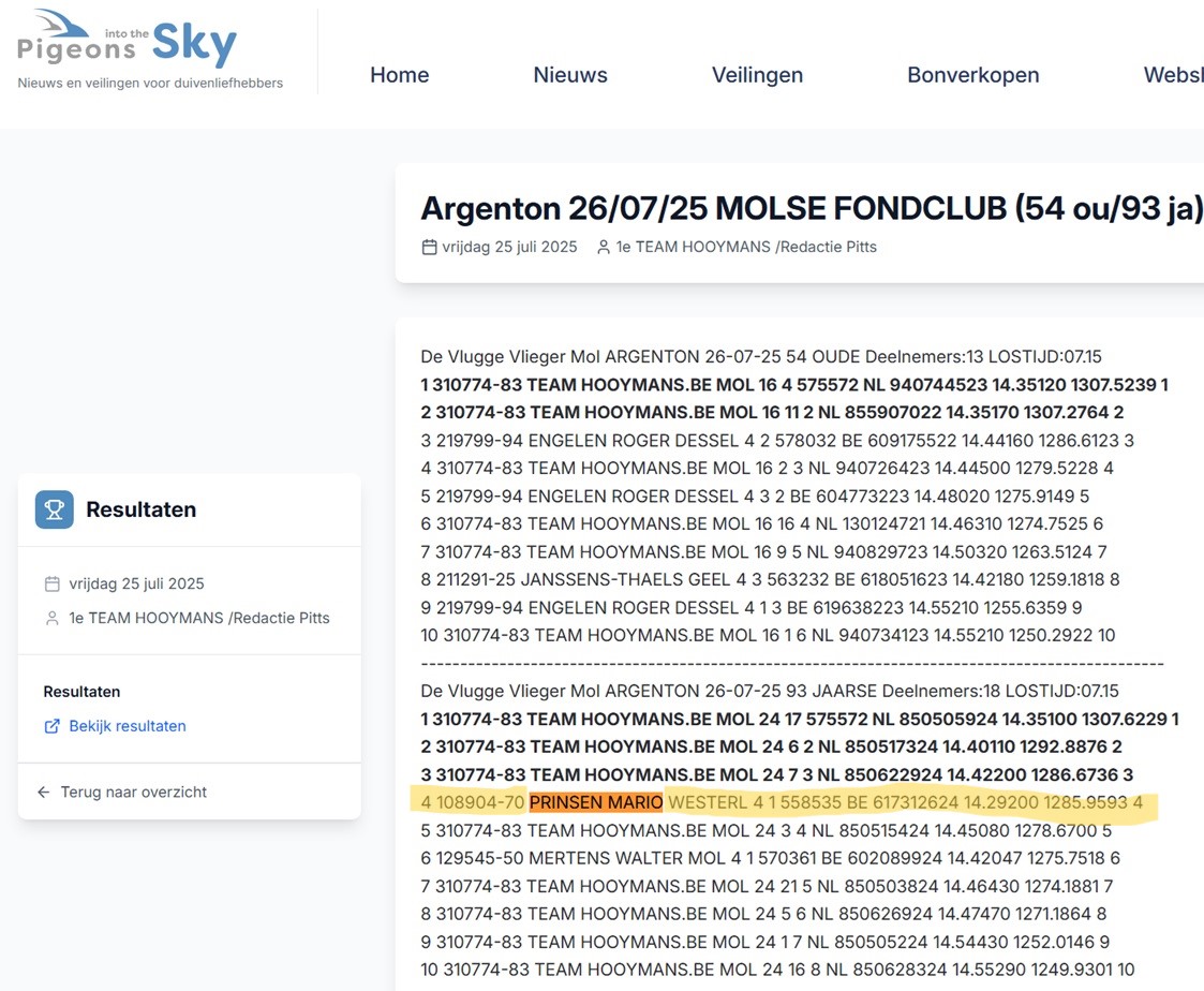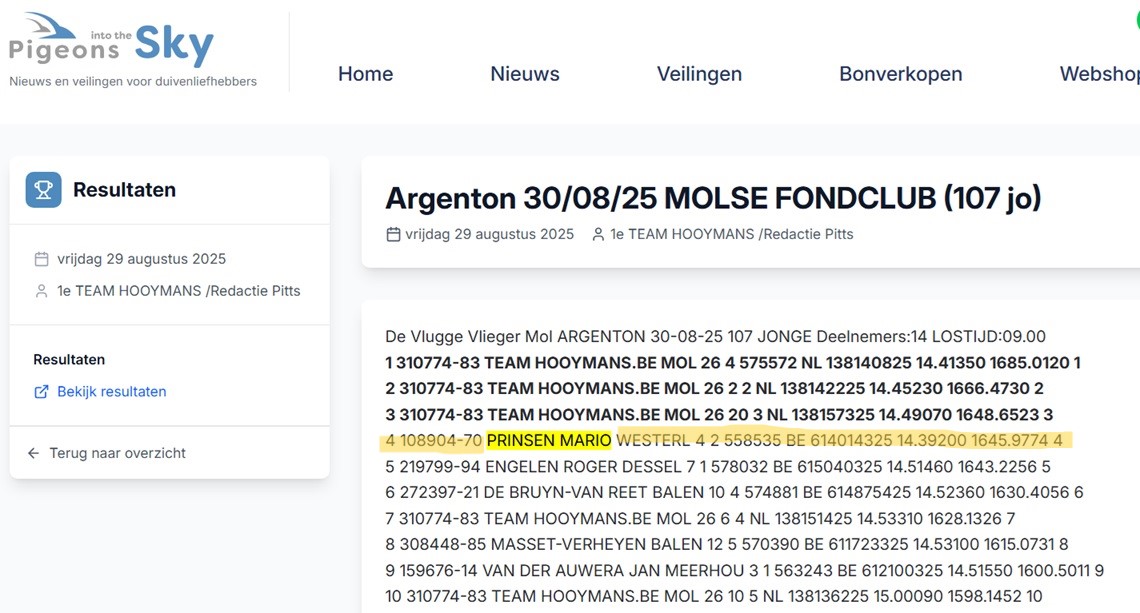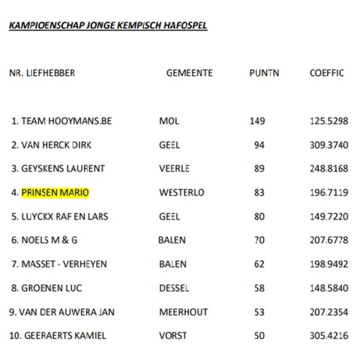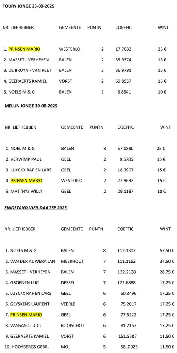Opnieuw mooie resultaten voor MARIO PRINSEN uit Tongerlo - Westerlo (Antwerpen), met volgende Top-Noteringen en Ereprijzen de voorbije seizoenen ...