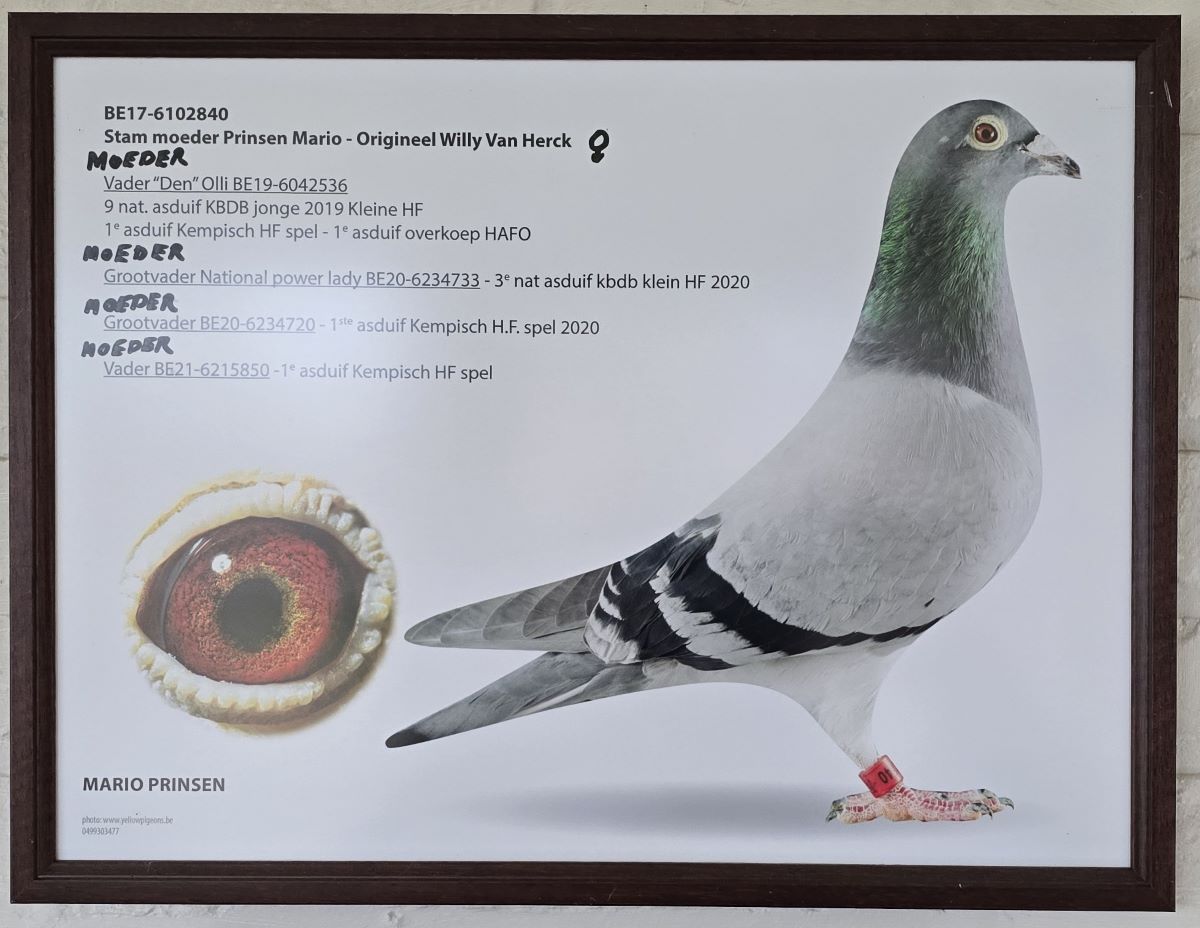 Om wekelijks topuitslagen te spelen in het samenspel Kempense Vliegers (Noyon) en het Kempisch Hafospel dien je te beschikken over een goede kwaliteit van duiven welke hier zeker aanwezig is.De stamvader (ras Olivier Geyskens) kan in een groot deel van Mario zijn duifjes teruggevonden worden.