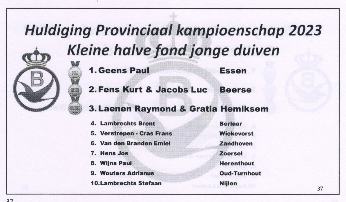 - 4de Provinciaal Kampioen Jonge Duiven Kleine Halve Fond 2019 Provinciaal PE Antwerpen.