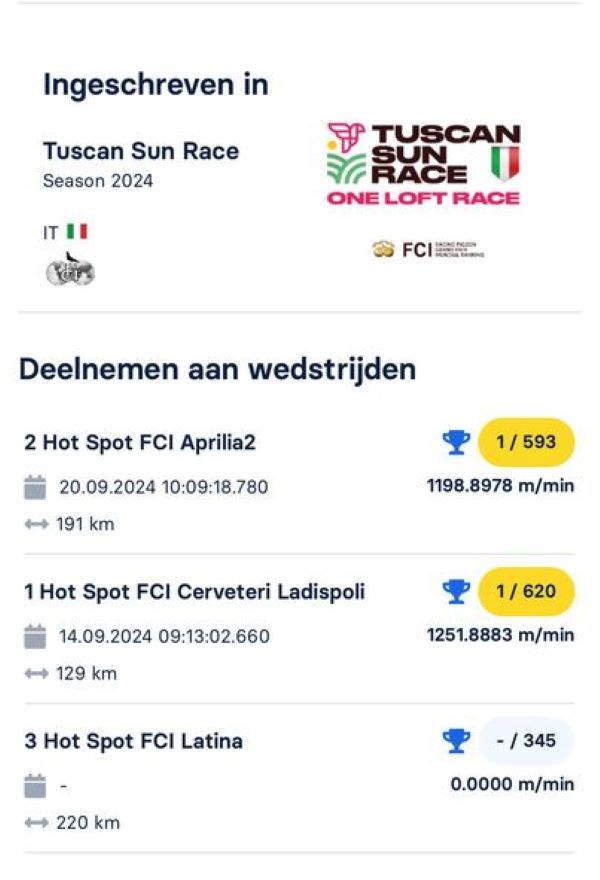16 september Topseizoen voor Team Hok Van den Bruel op beide locaties. [💥] Proficiat Kurt , Nancy , Robin en Jolien [🍾] Trots dat we hierin een klein deeltje hebben in kunnen bijdragen. 444/24 > 14° Nationale Asduif KBDB GHF [🇧🇪] en 6° beste jonge over de 5 nationale vluchten. = Kleinkind uit Sofieke 186/21 Hok VC 431/24 > 32° Nationale Asduif KBDB GHF [🇧🇪] en 8° beste jonge over de 5 nationale vluchten = kind uit de Fijne (9° Nationaal Bourges) x Sofieke 186/21 Hok VC
