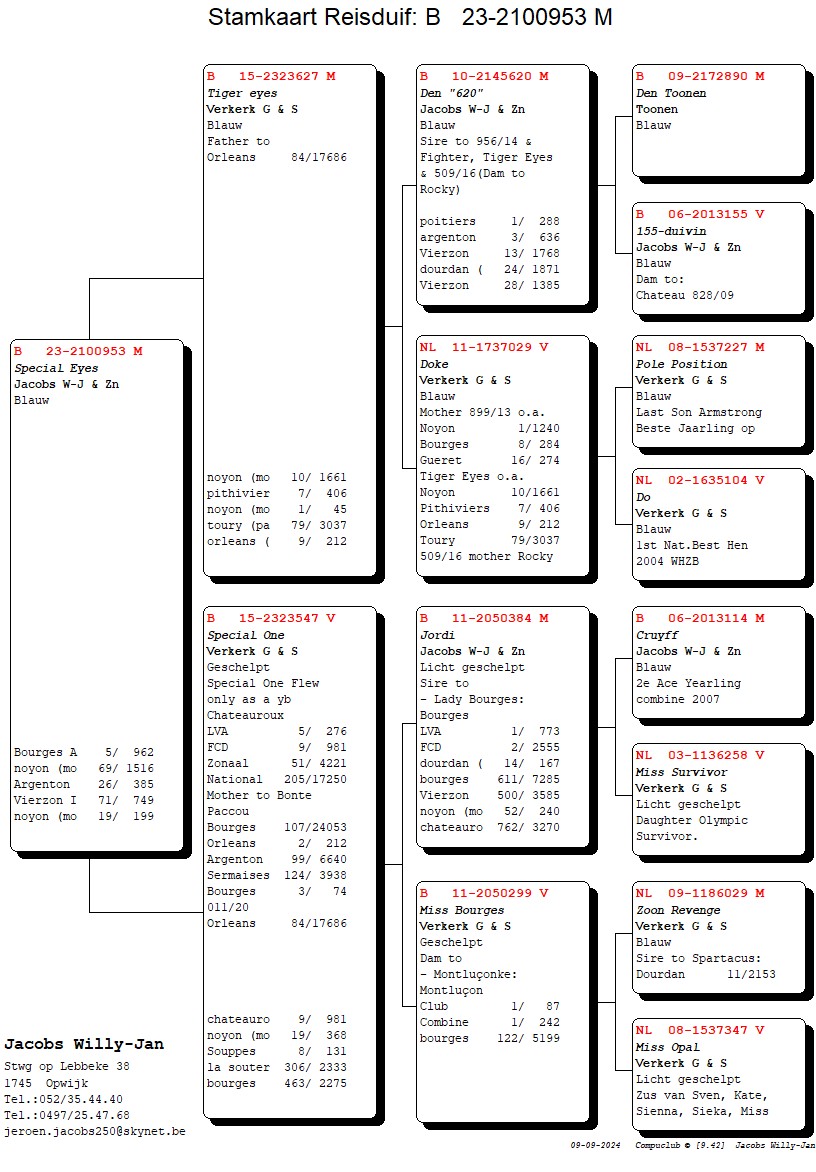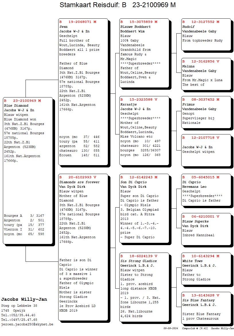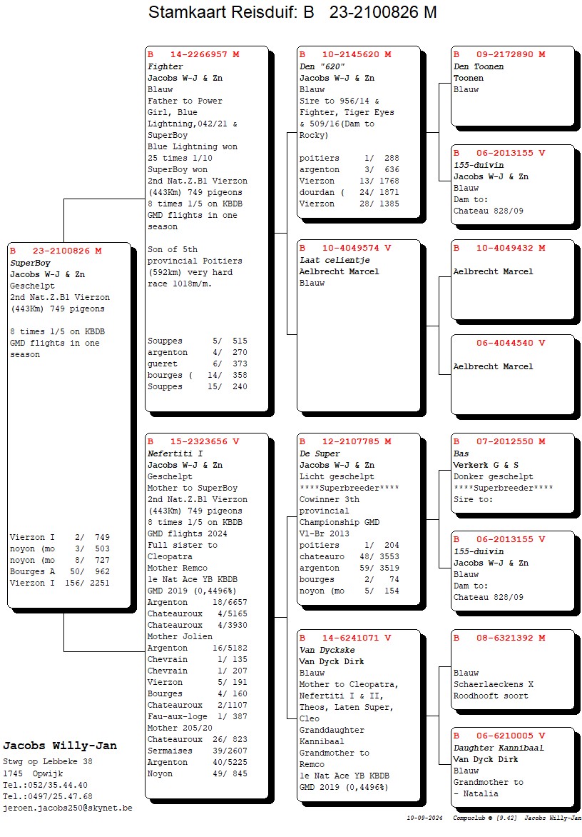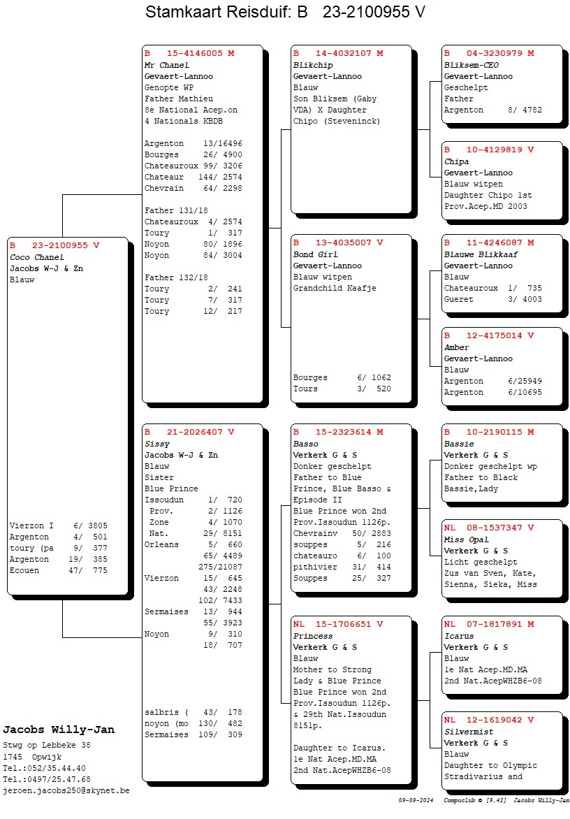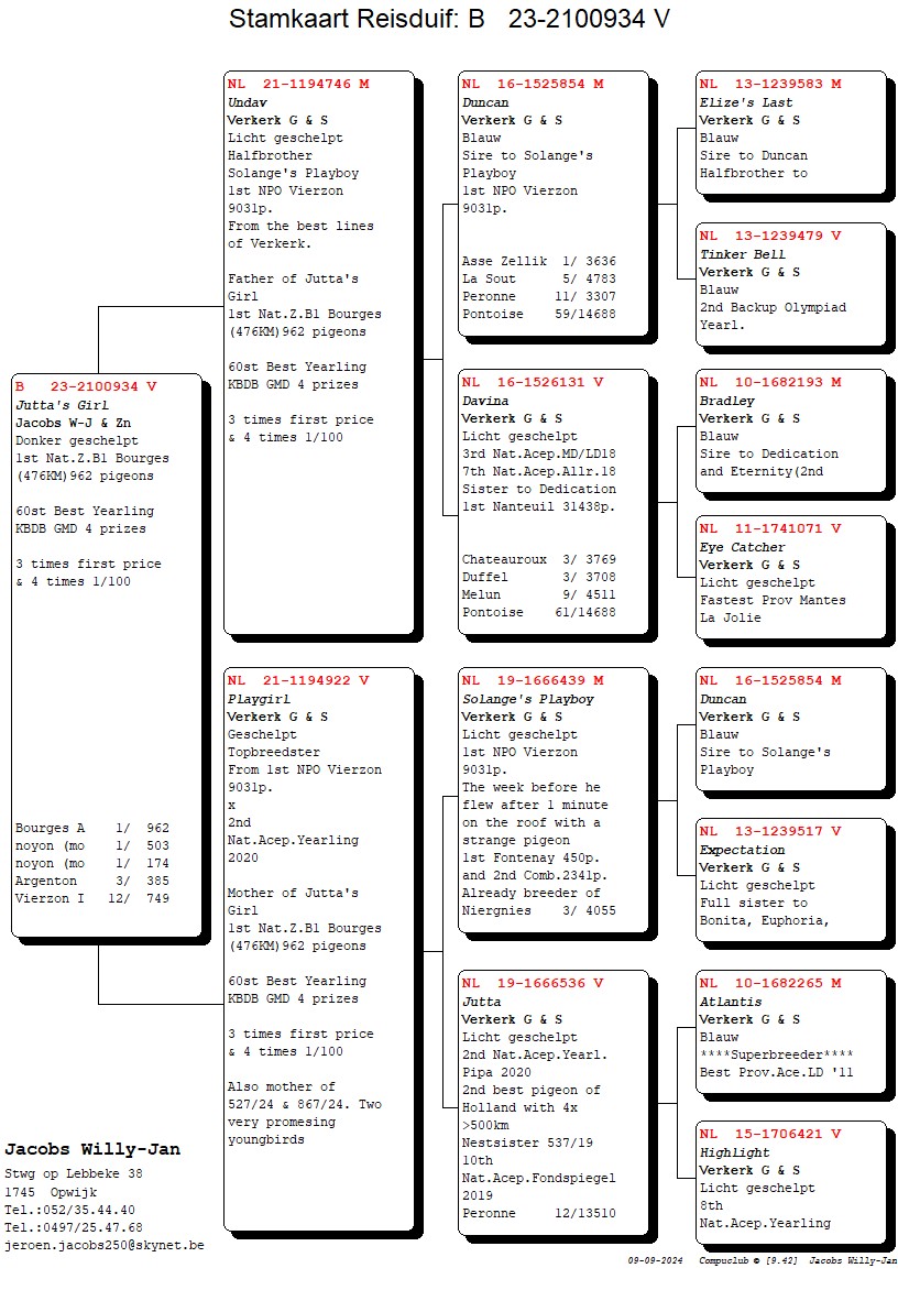 Jan & Tom Iwens (St-Kat-Waver) : Via Patrick Van den Abbeel bekwam deze combinatie een kleinkind van het topkoppel Julius x Cleopatra (Ouders Remco, 1e nationale asduif KBDB jonge 2019). Uit deze doffer kweekten Jan & Tom de 044/23. Deze vloog de 2e Nationaal Argenton tegen 1787 duiven! Tevens 1e Provinciaal en Zonaal. Eerder vloog deze duivin reeds : Quiévrain 1/164, Sermaises 3/124, Noyon 3/44, Melun 4/261, Melun 9/201, Melun 15/1135, Sermaises 16/1084, Sermaises 21/414, Quiévrain 24/343, Sermaises 38/415, Noyon 66/931, Argenton 628/11777, Bourges 974/19369