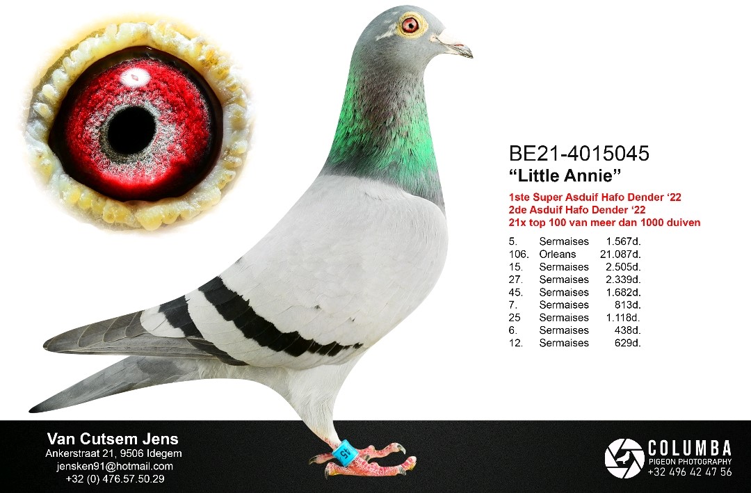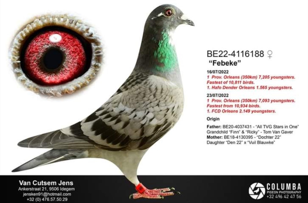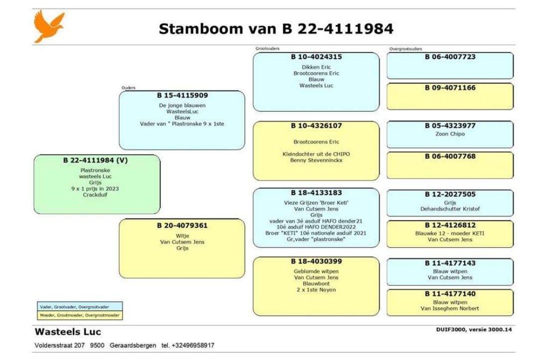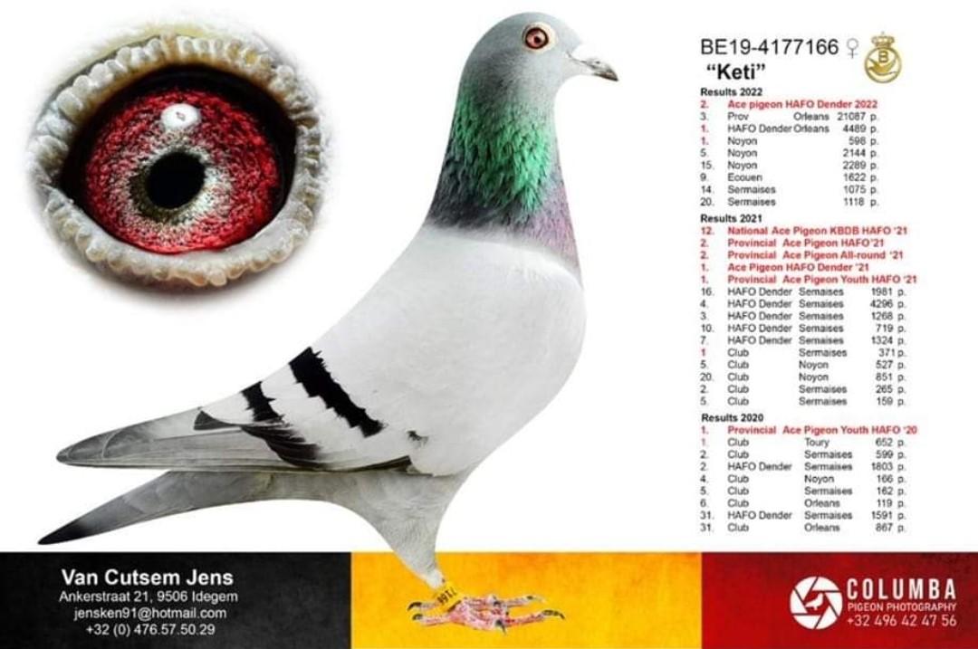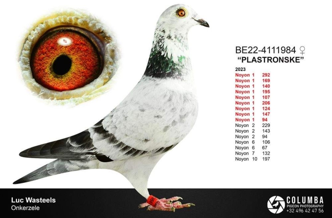 Bij Luc Wasteels vloog BE22-4111984 “Plastronske” liefst 9 maal de 1e prijs van Noyon. Deze snelheidsduivel heeft als moeder een rechtstreekse Jens van Cutsem. De vader van deze duif “Vieze Grijze” en is een volle broer van Jens zijn “Keti”. De “Vieze Grijze” is bij Jens ook reeds kweker van enkele toppers.