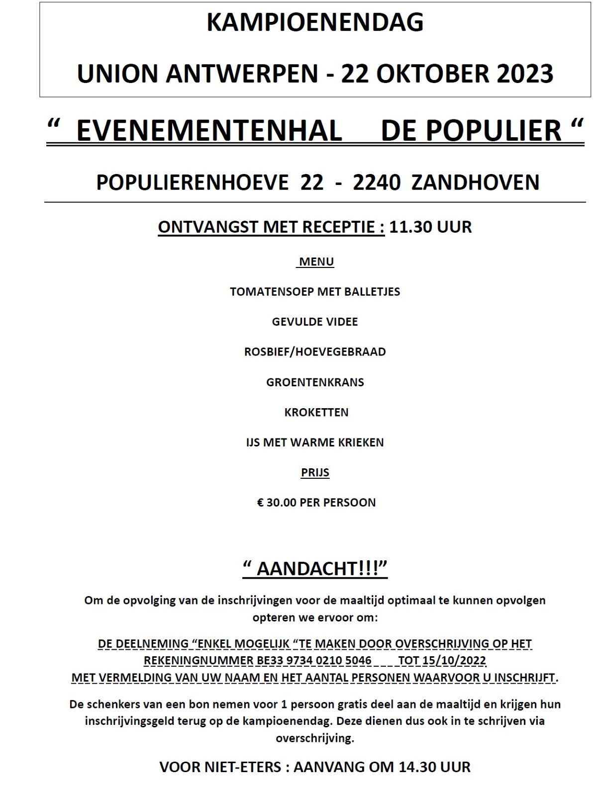 de Kampioenenviering van UNION ANTWERPEN heeft plaats op ZONDAG 22 OKTOBER 2023 in de "EVENEMENTENHAL DE POPULIER", POPULIERENHOEVE 22 te 2240 ZANDHOVEN.