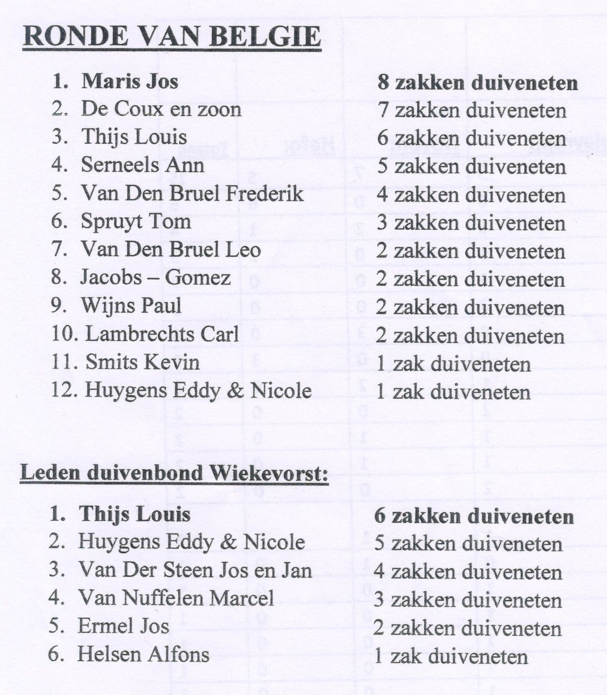 - Kampioen Jonge duiven Quievrain: Louis Thijs (Wiekevorst)