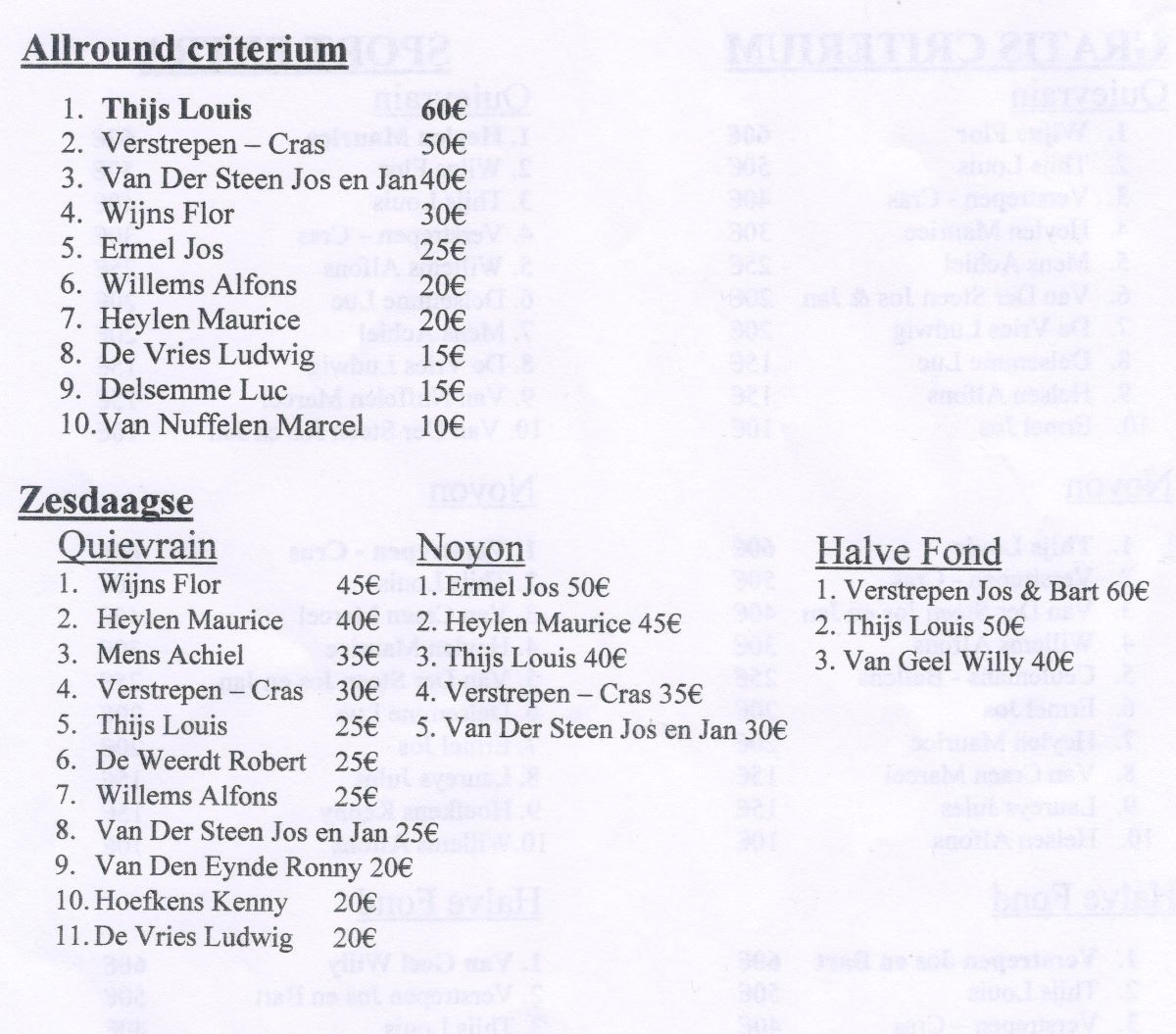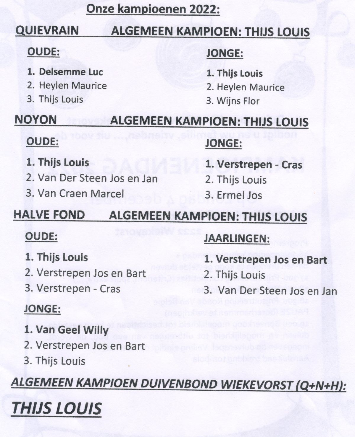 - Kampioen Oude duiven Halve Fond: Louis Thijs (Wiekevorst)