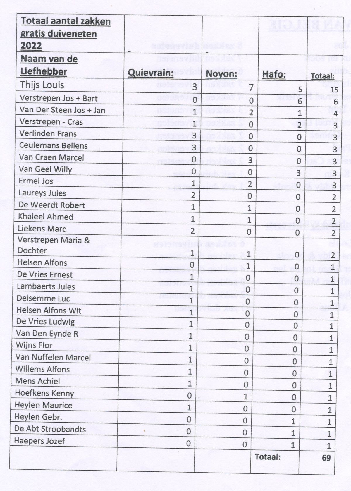 - Kampioen Oude duiven Quievrain: Luc Delsemme (Morkhoven)
