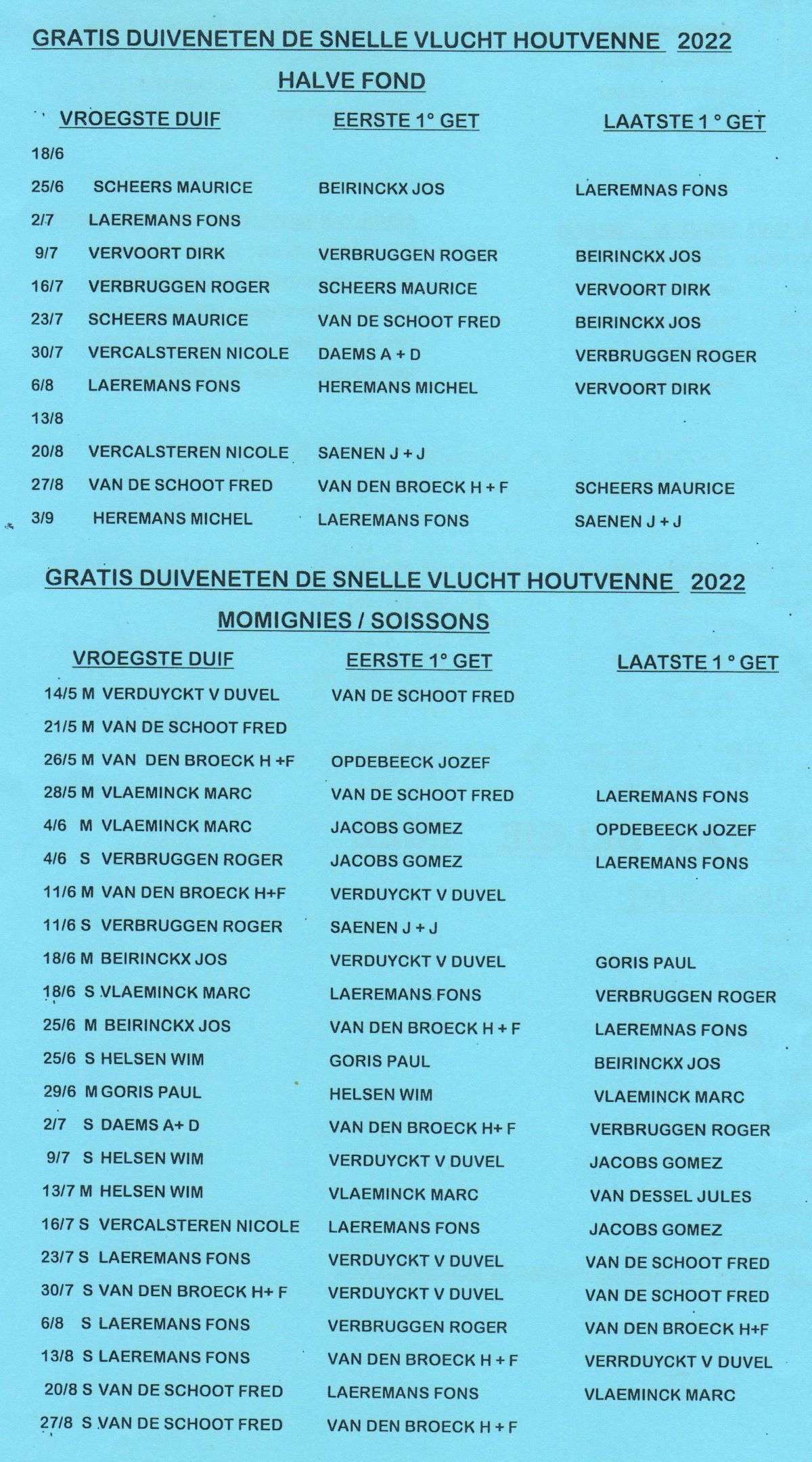 - Kampioenschappen 2022 de Snelle Vlucht Houtvenne