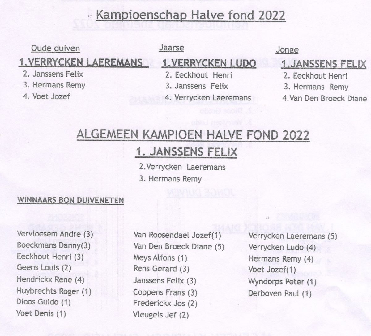 - Kampioen oude duiven Halve Fond: Verrycken-Laeremans Houtvenne