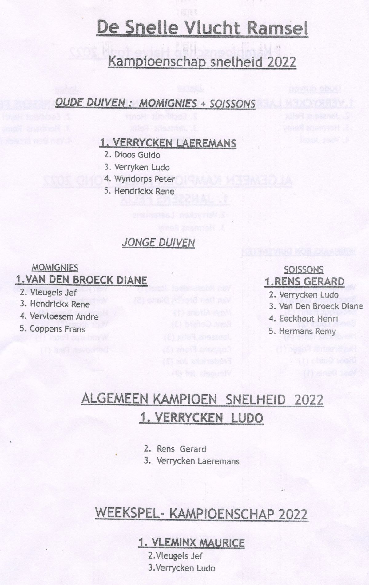 - Kampioen oude duiven Snelheid: Verrycken-Laeremans Houtvenne